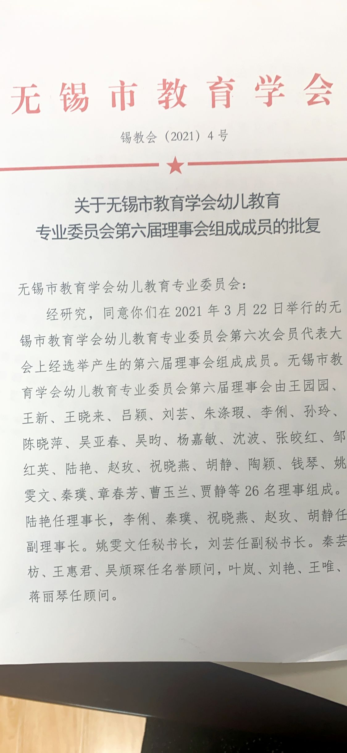 赵玫老师经选举成为无锡市学前教育学会幼儿教育专业委员会第六届副理事长