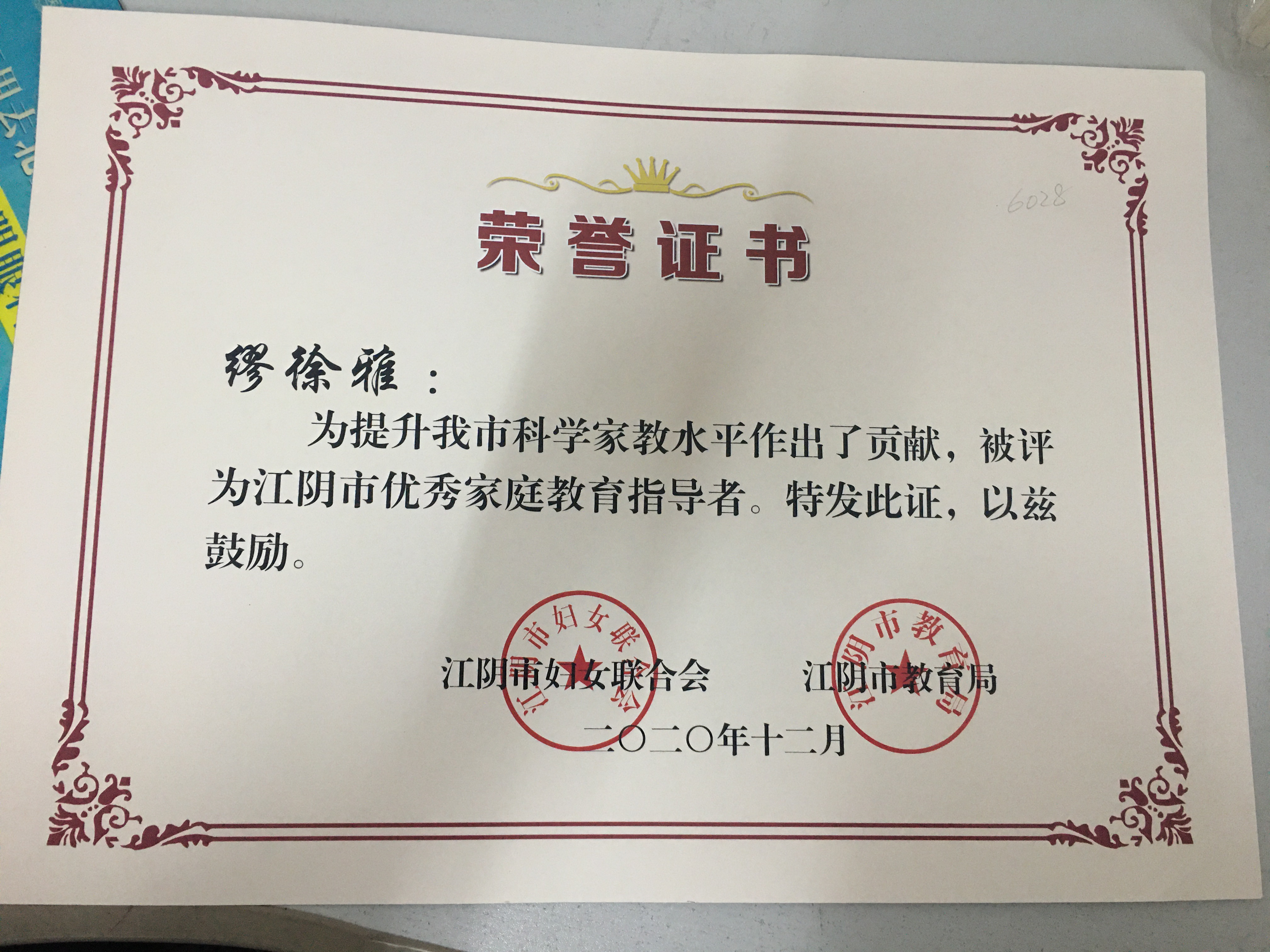 缪徐雅—评为江阴市优秀家庭教育指导者
