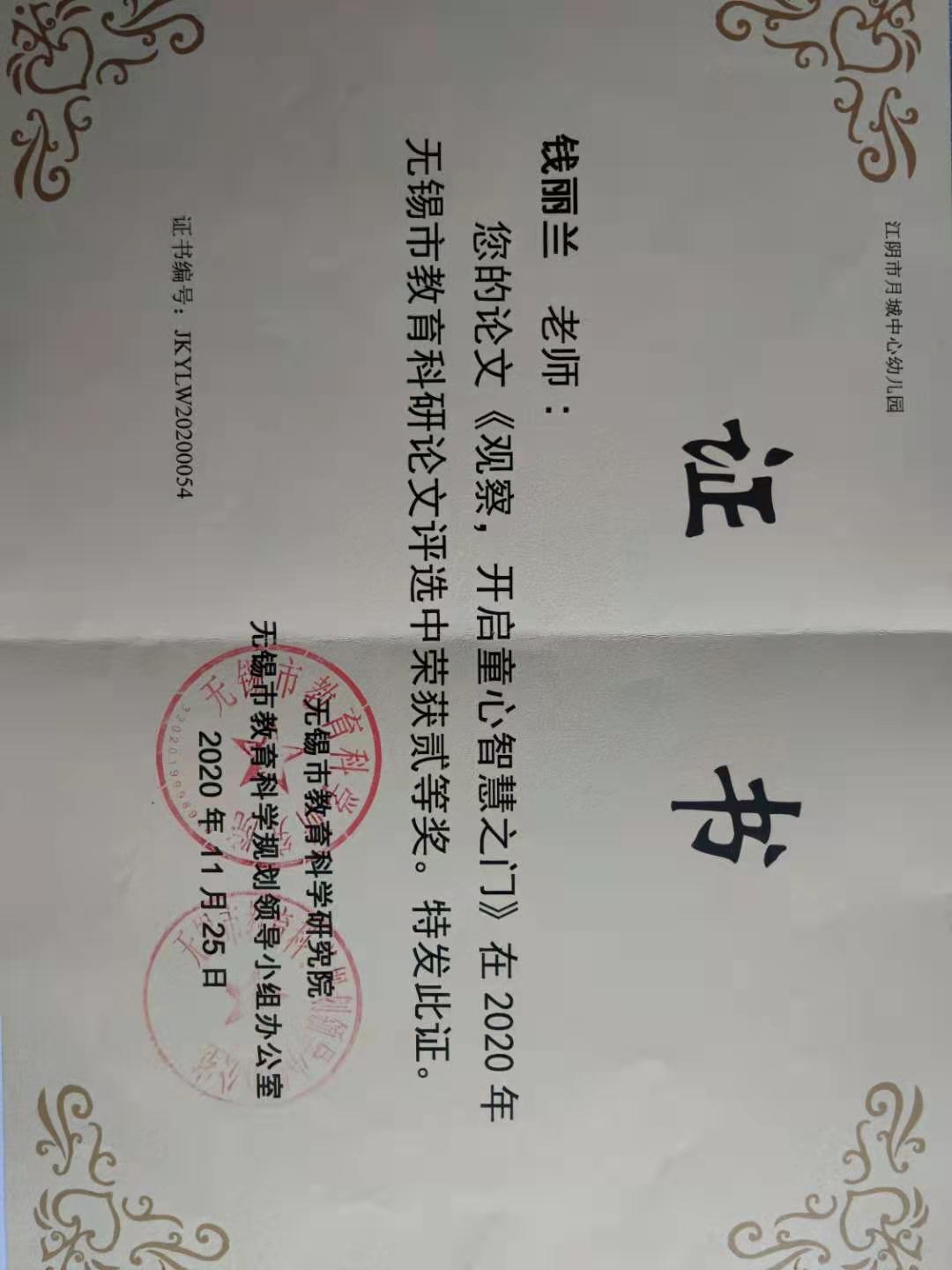 钱丽兰老师的论文《观察,开启童心智慧之门》获无锡市教育科研论文二等奖