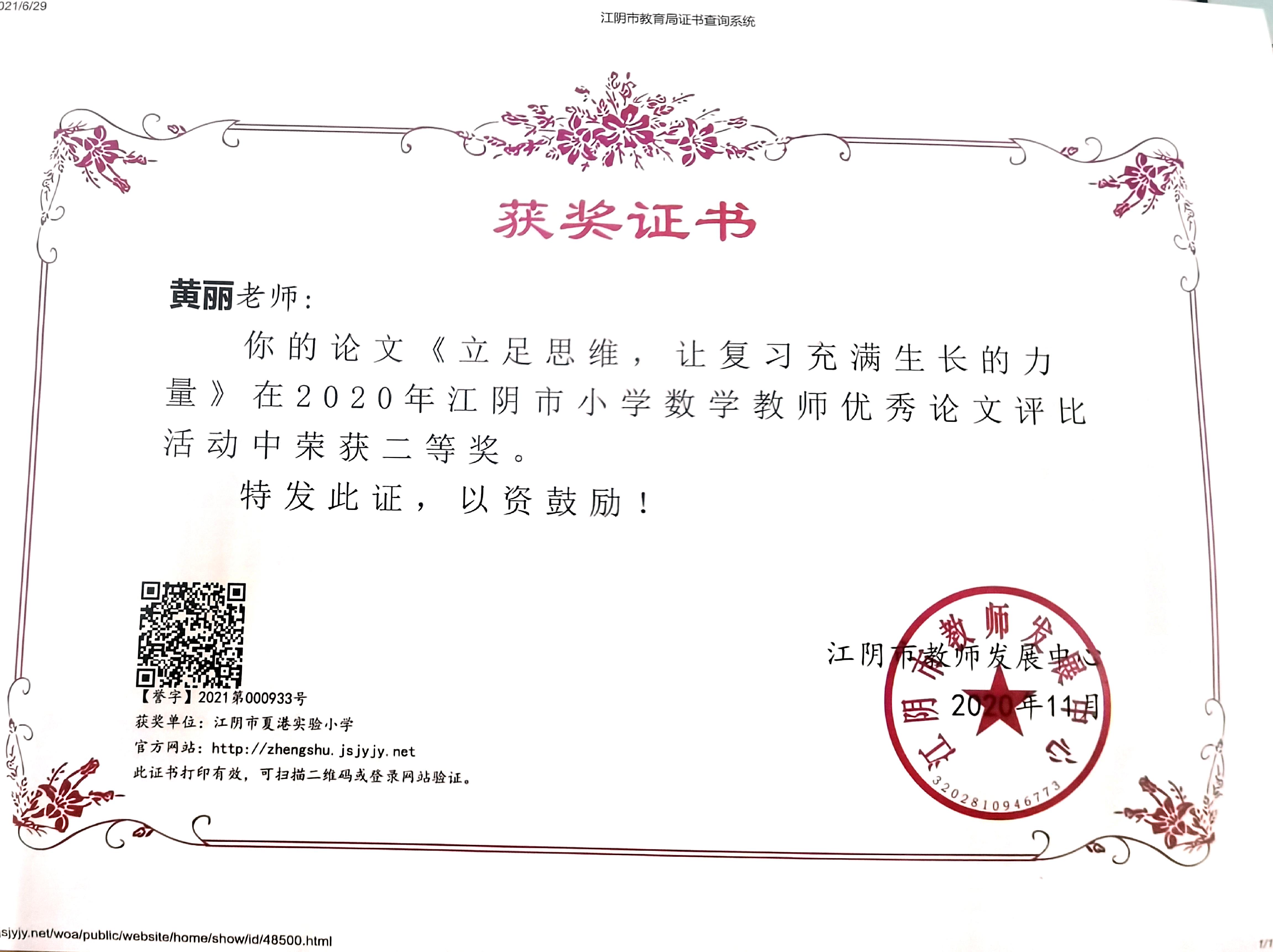 论文《立足思维,让复习充满生长的力量》获市二等奖