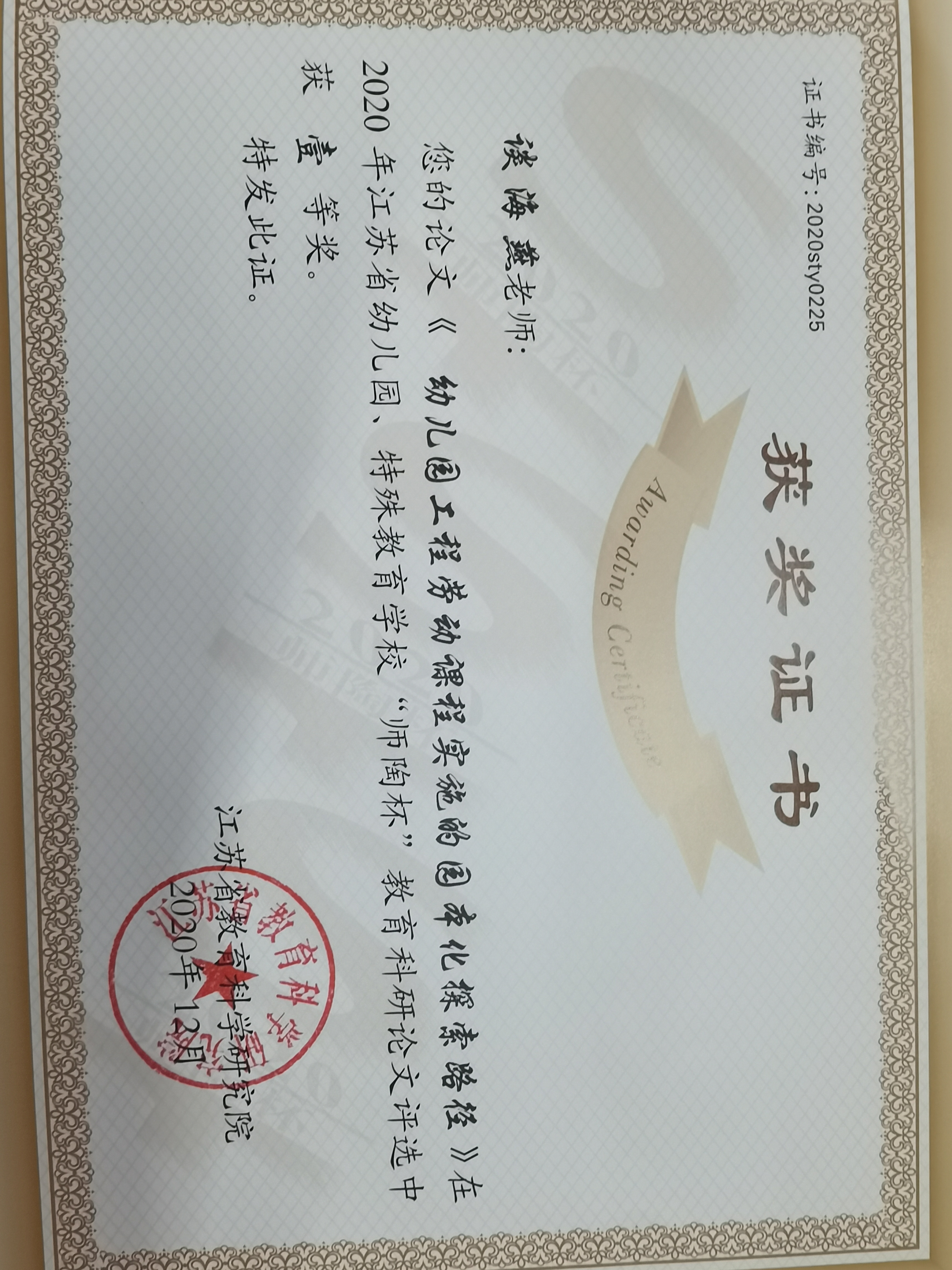 谈海燕论文《幼儿园工程劳动课程实施的园本化探索路径》获江苏省“师陶杯”教育科研论文评选一等奖