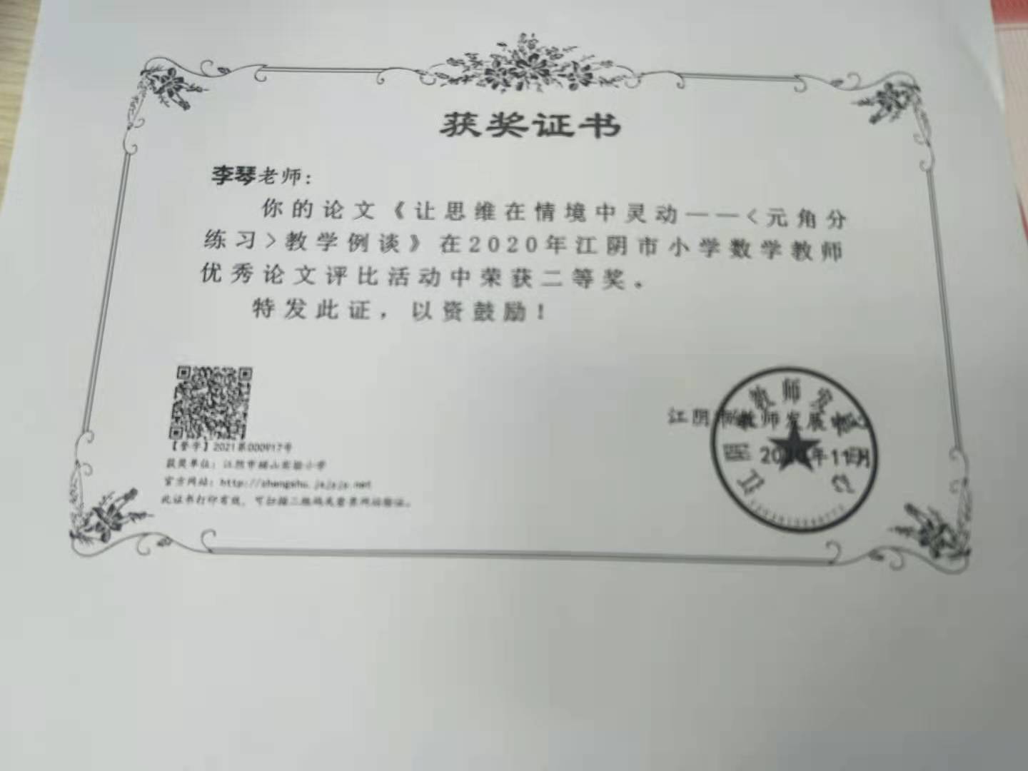 论文《让思维在情境中灵动——《元、角、分》教学例谈》获二等奖