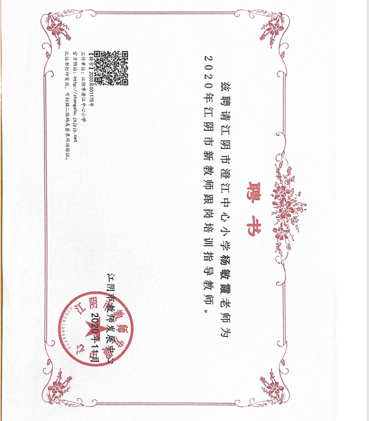 杨敏霞被聘为“江阴市新教师跟岗培训指导教师”