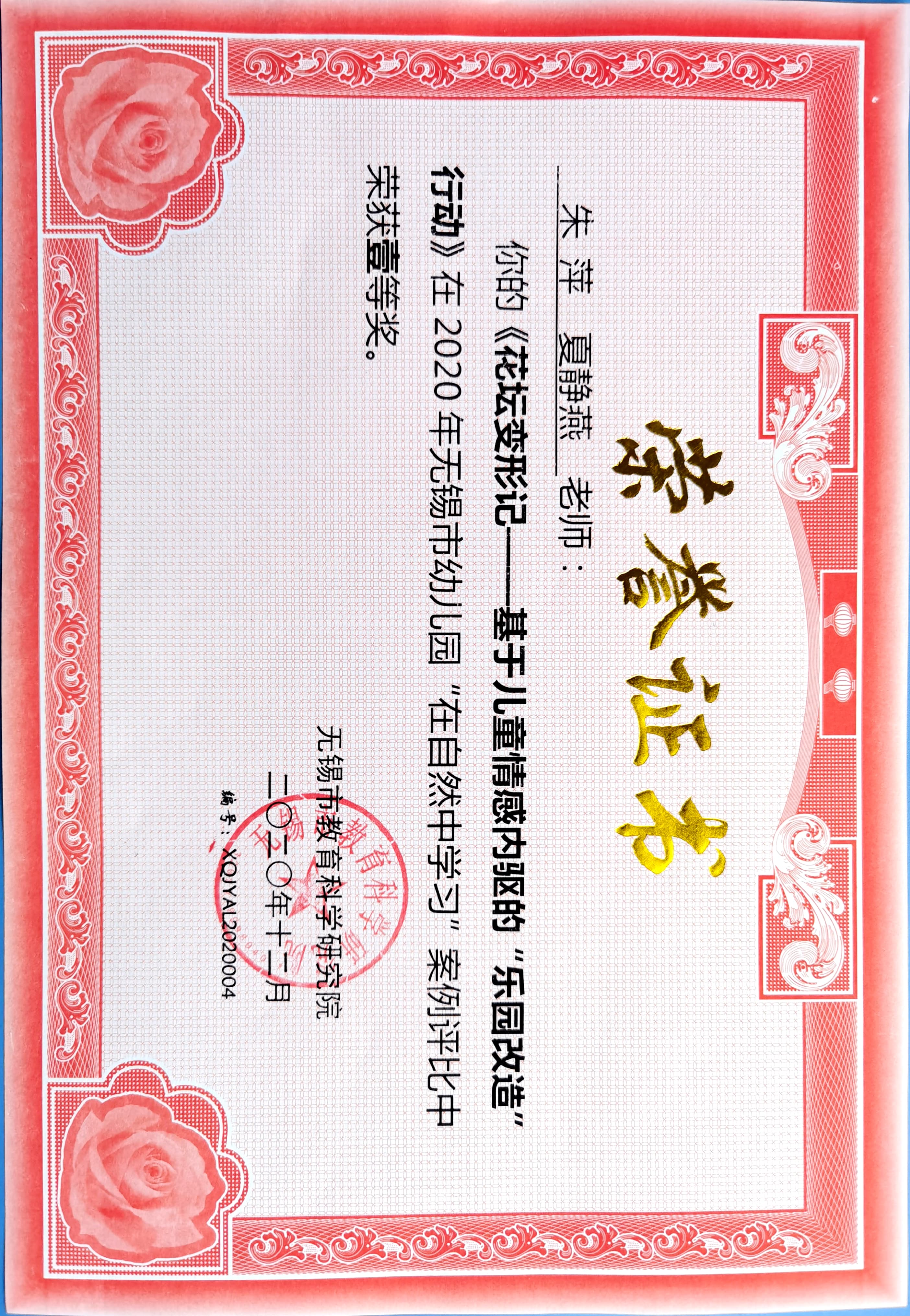 夏静燕获无锡市幼儿园案例评比一等奖