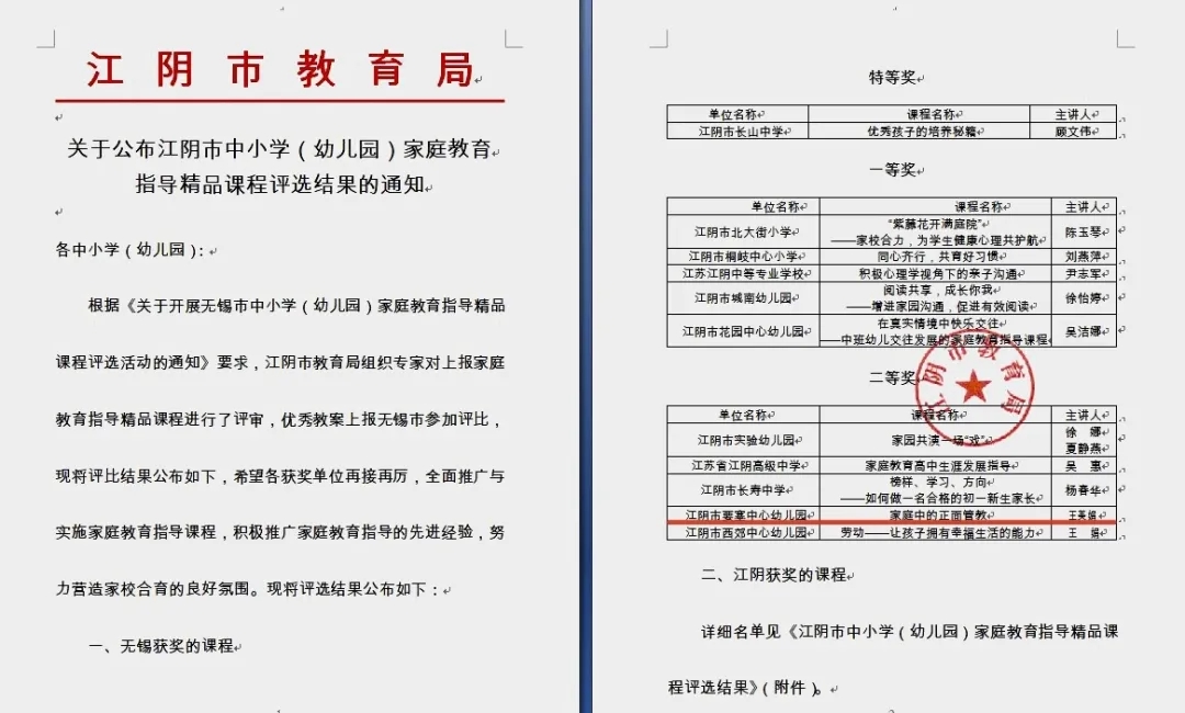 江阴市西郊中心幼儿园家庭教育精品课程喜获一等奖