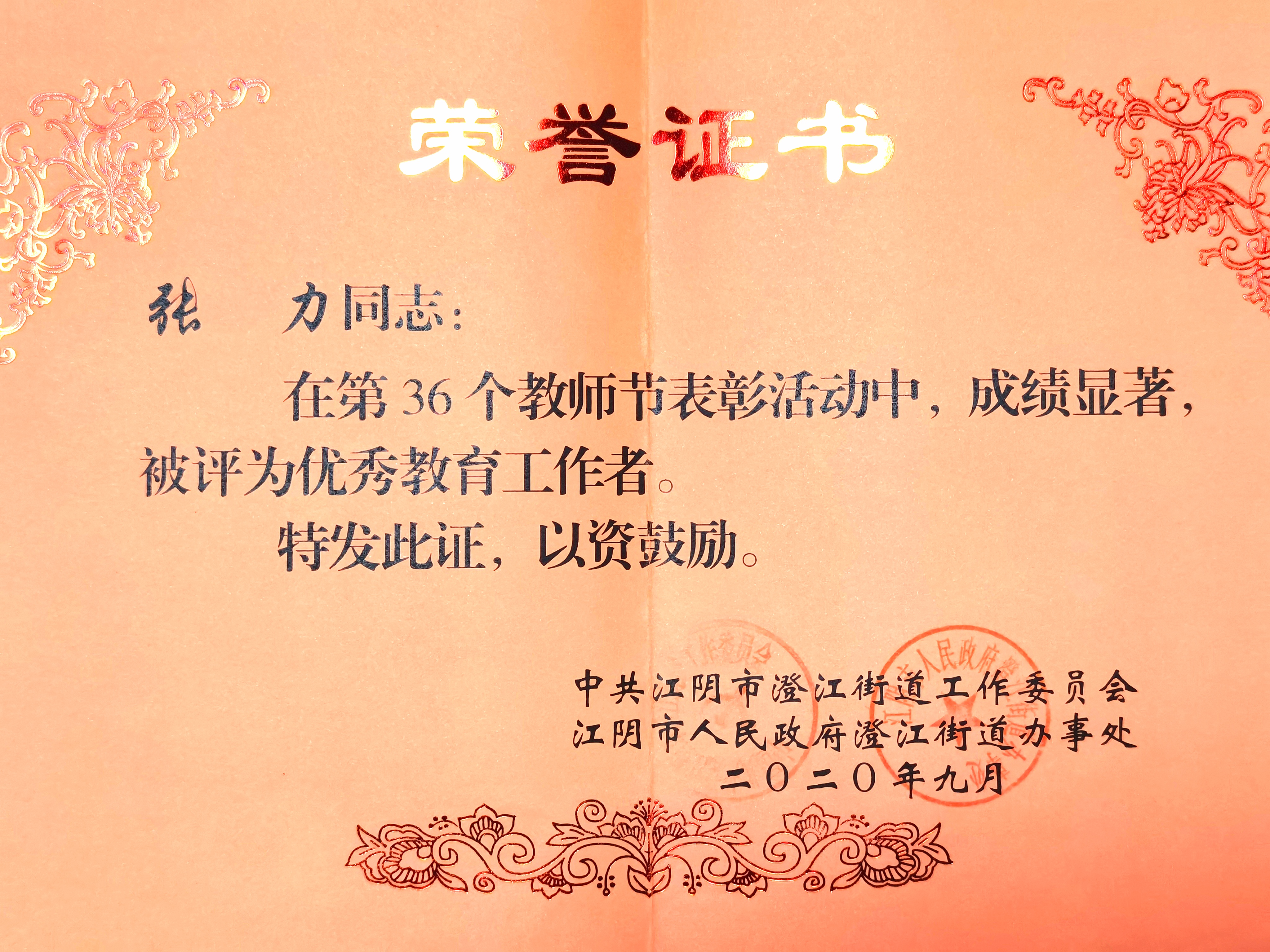 张力在第36个教师节表彰中,被评为“优秀教育工作者”