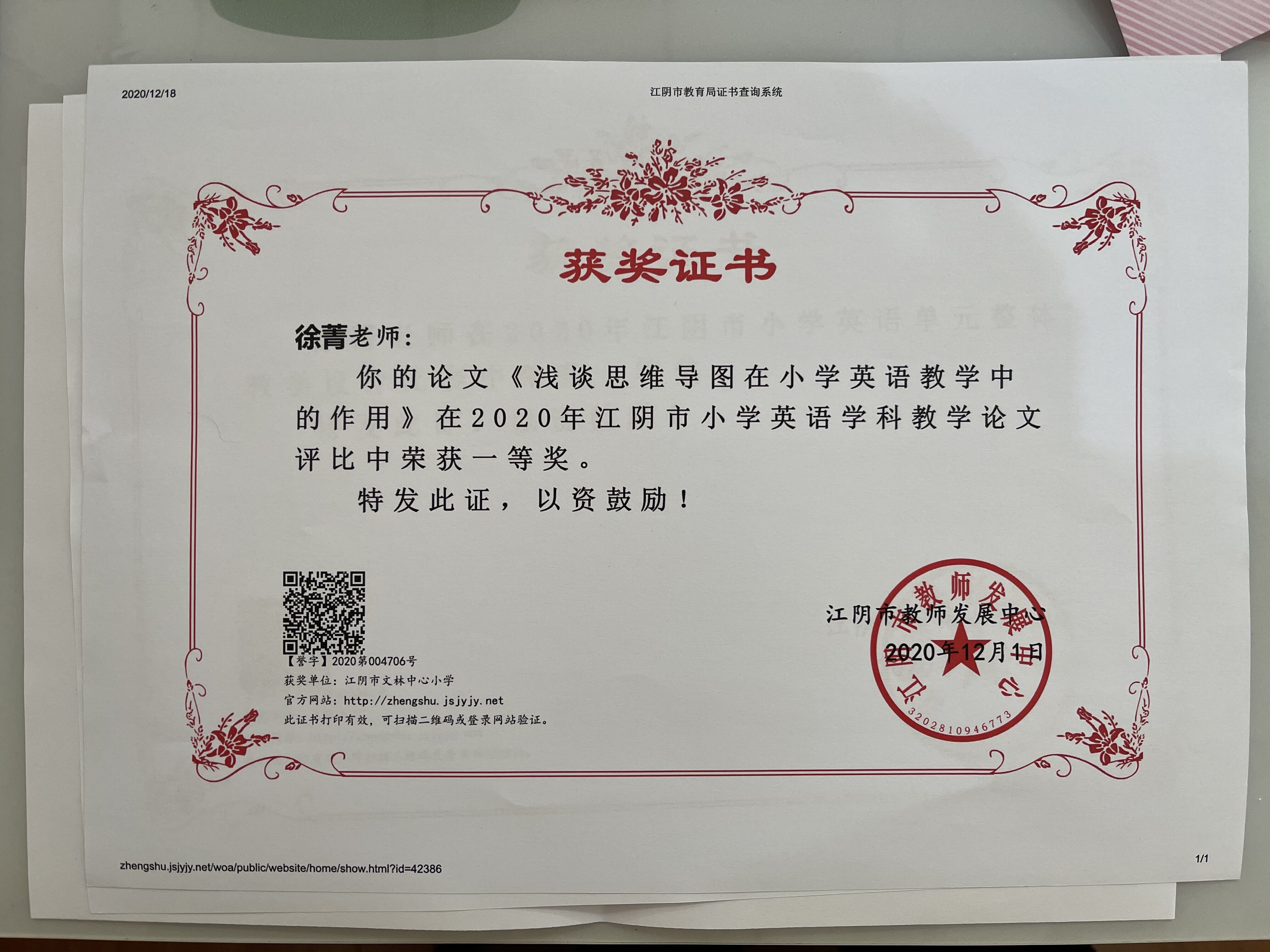 黄慧老师辅导学生获得无锡市第二十三届学生英语口语大赛决赛一等奖