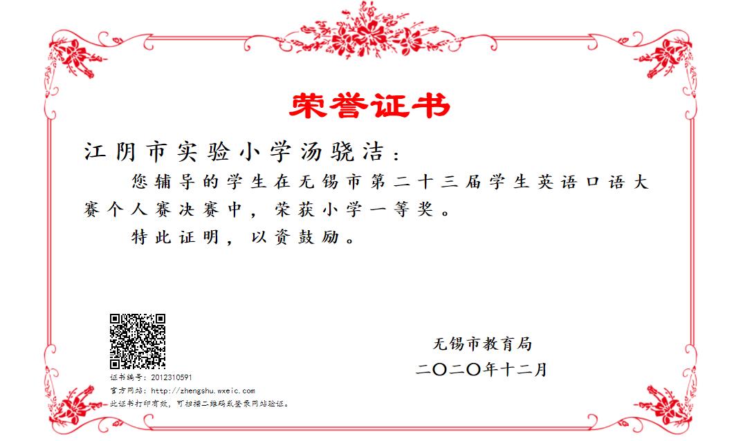 汤骁洁老师辅导学生获得无锡市第二十三届学生英语口语大赛决赛一等奖