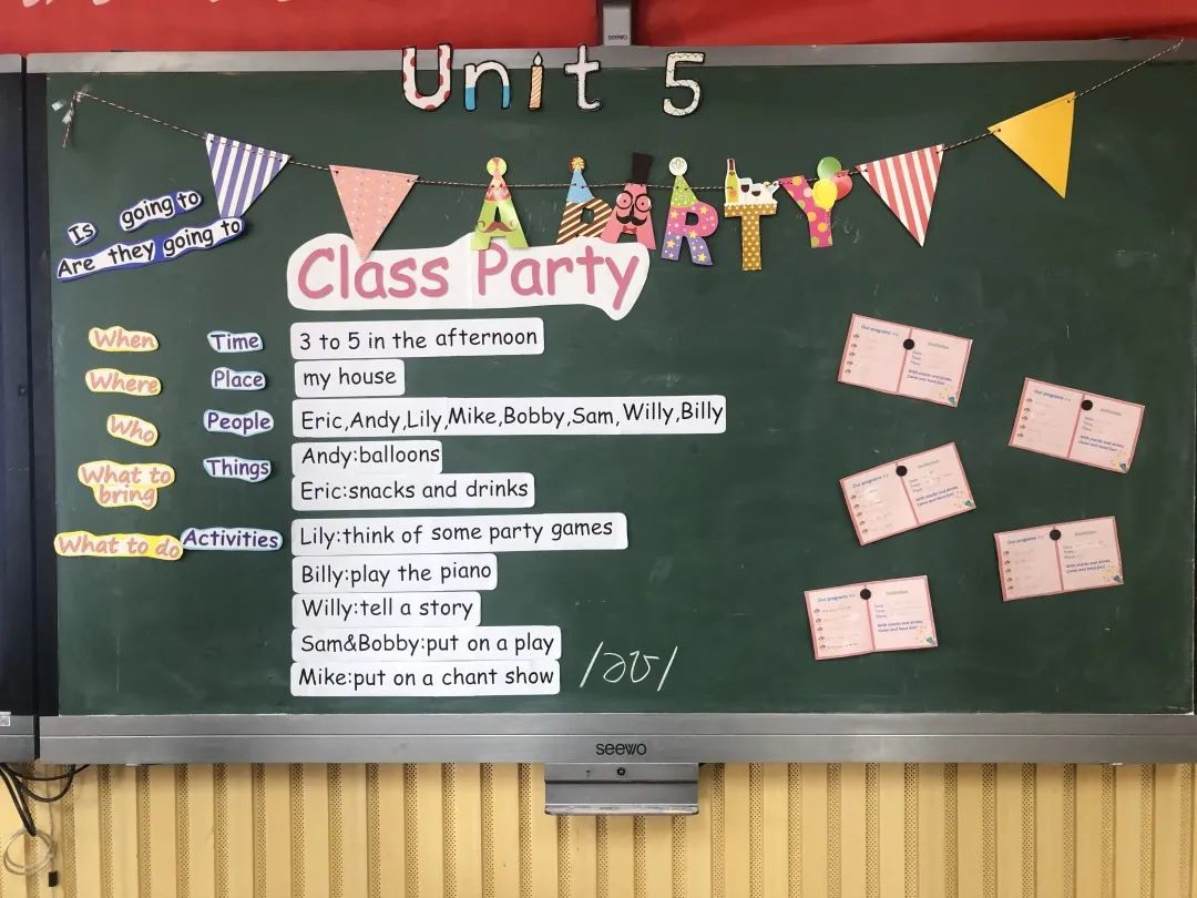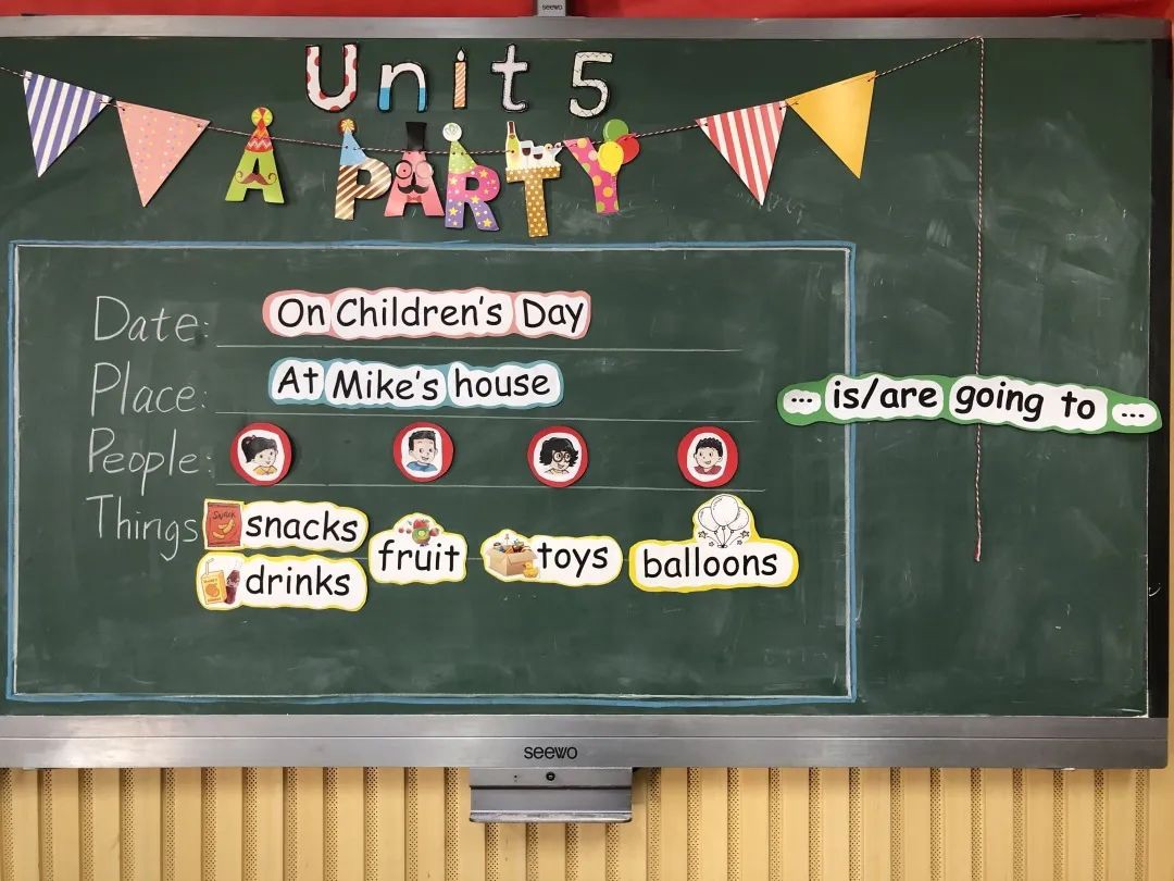 单元整体教学,就是把单元看成一个学习整体,在明确的学习目标统领下,对一个单元的学习内容和活动进行系统规划,整合设计,关注联系,关注发展,充分发挥和落实单元学习价值,以清晰的路径促进学生英语素养的提升。三位老师已经对单元整体教学有了初步的认识与实践,在前期准备时,共同探讨了Unit5 A party的教学目标、重难点、板块划分、板书设计等。