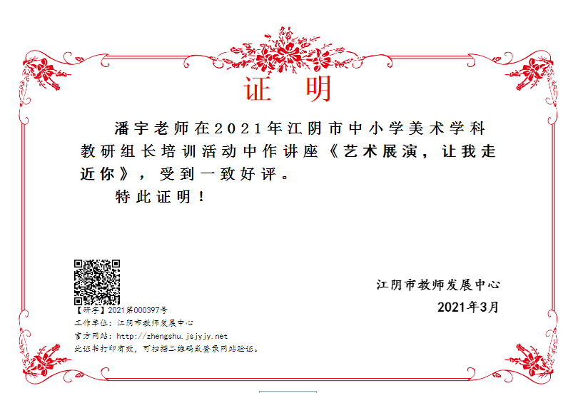 网站类目:专题讲座 活动级别:县级 活动类别: 执教姓名:潘宇 所在单位:江阴市教师发展中心 执教时间:2021-03-09 执教地点:江阴市教师发展中心 执教内容:《艺术展演,让我走近你》 参加对象:全市中小学美术教研组长