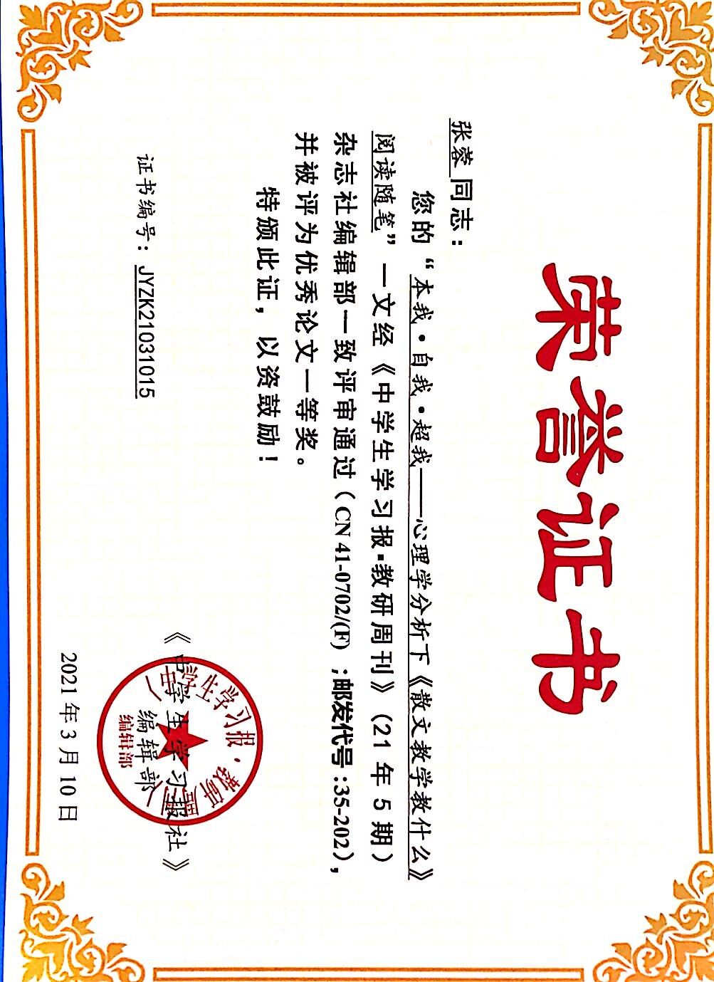 季春花工作室成员张蓉老师在《中学生学习报·教研周刊》发表省级论文《本我·自我·超我——心理学分析下<散文教学教什么>阅读有感》