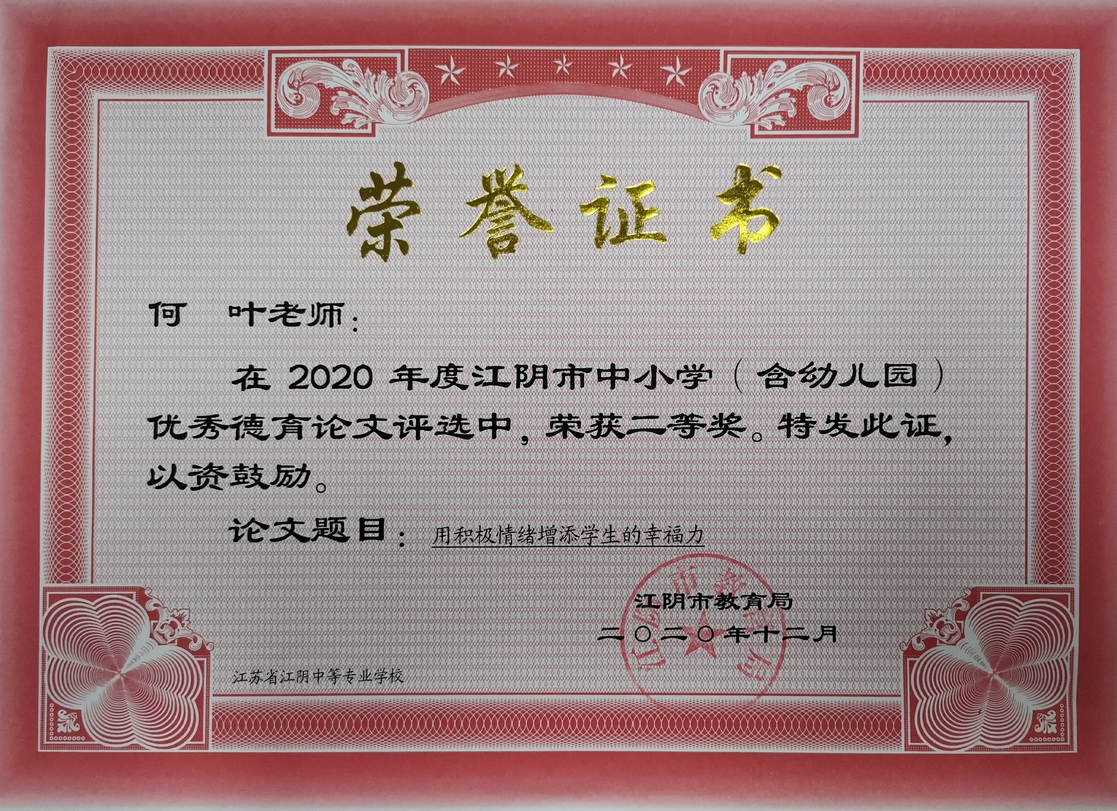 何叶老师的论文《用积极情绪增添学生的幸福力》获江阴市优秀德育论文二等奖