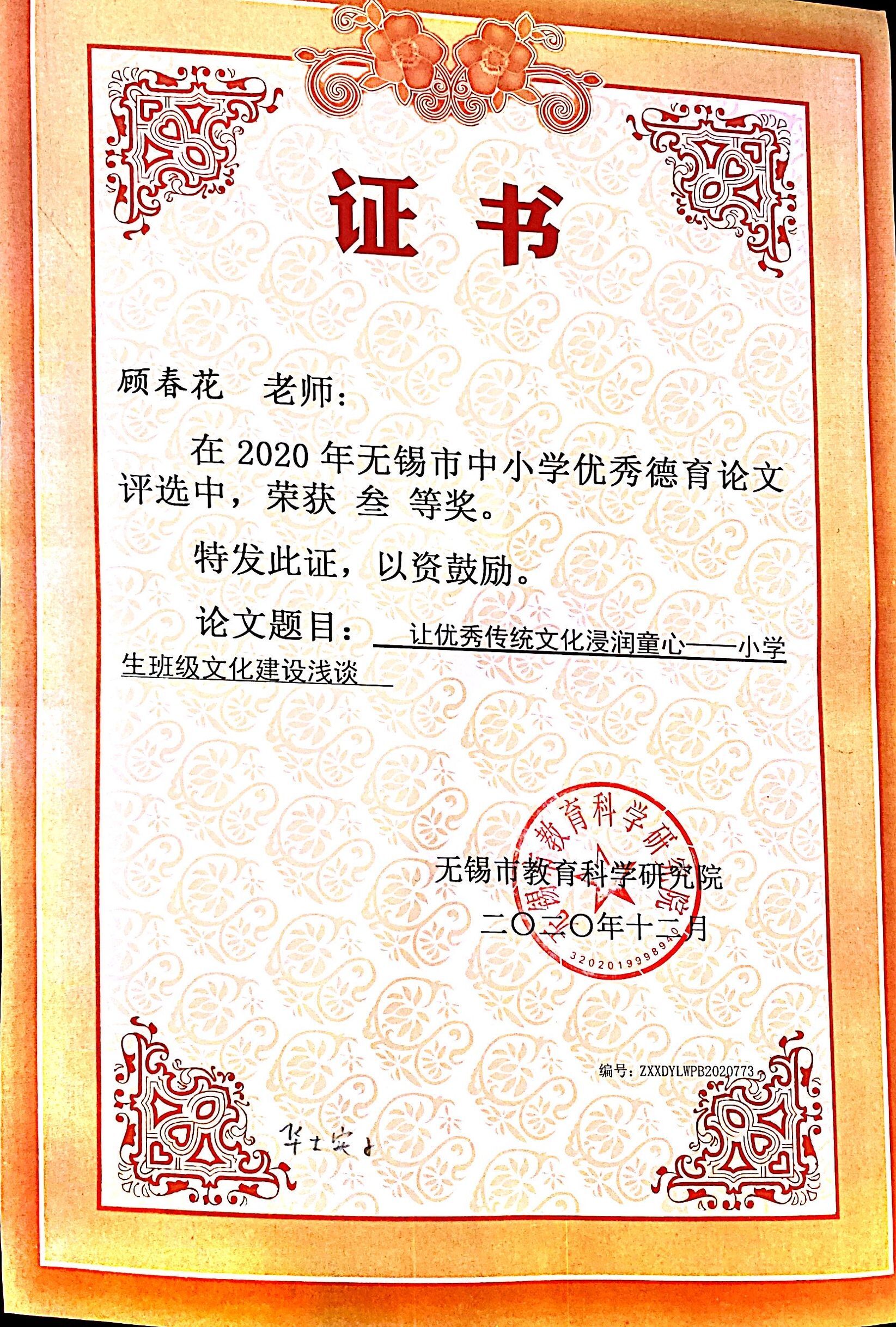 余家宇名师工作室成员顾春花老师获得无锡市中小学优秀德育论文三等奖 2021-08-19