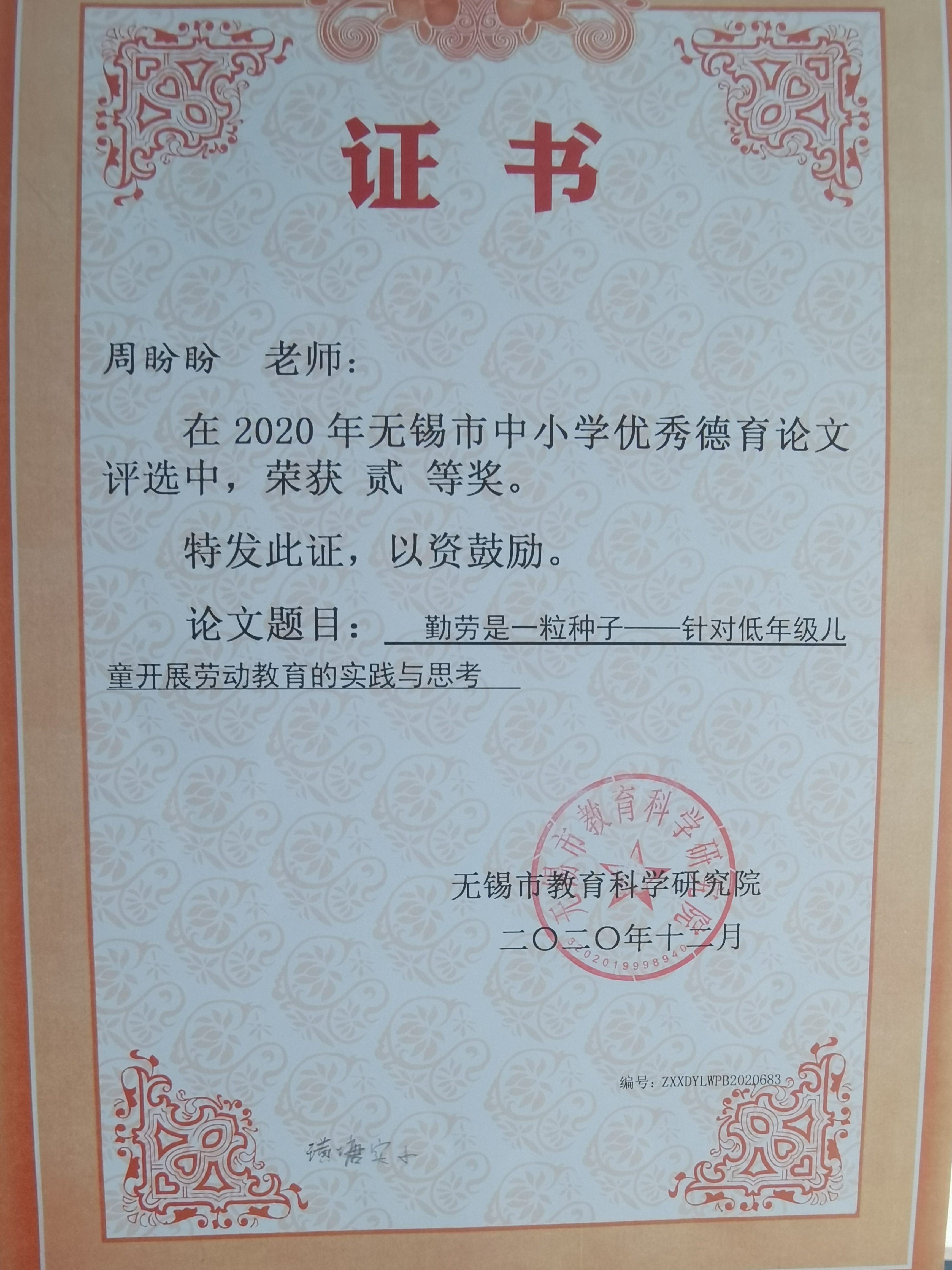 余家宇名师工作室成员周盼盼老师获得无锡市中小学优秀德育论文二等奖 2021-08-19