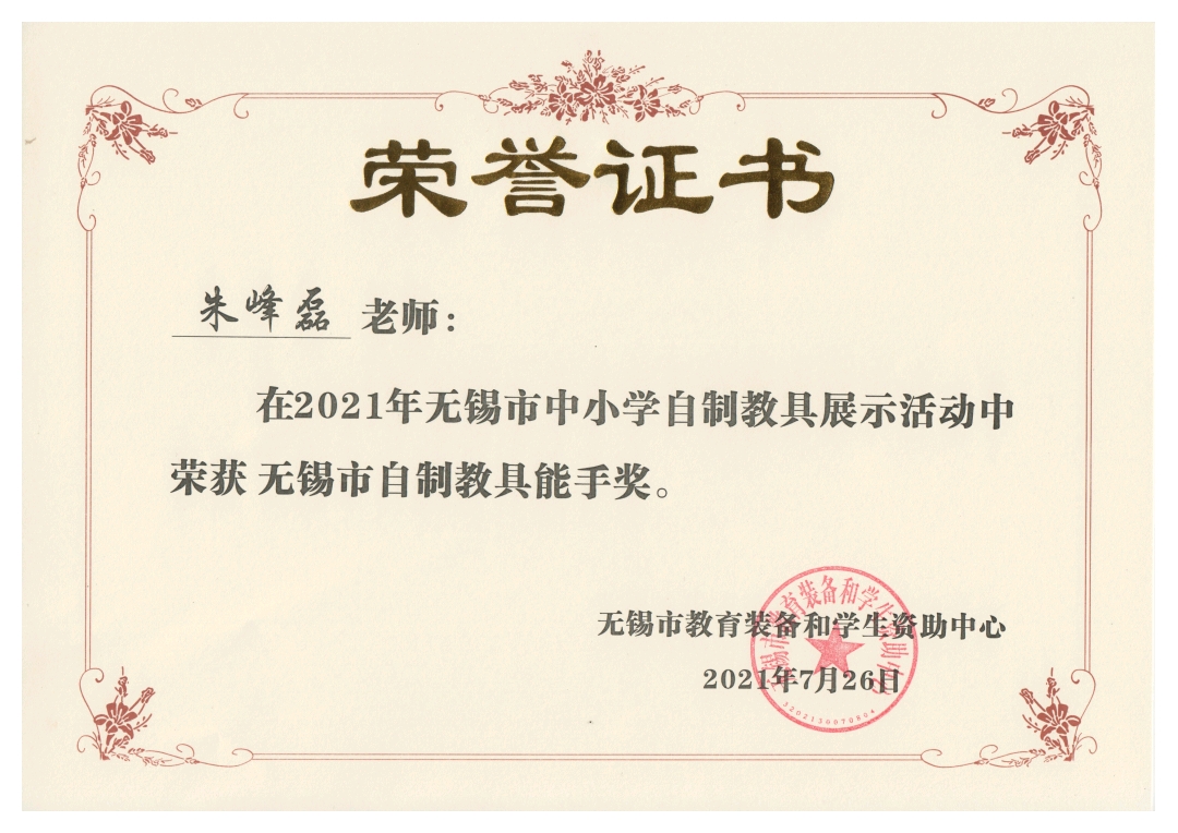工作室成员华西实验学校朱峰磊老师荣获无锡自制教具能手称号