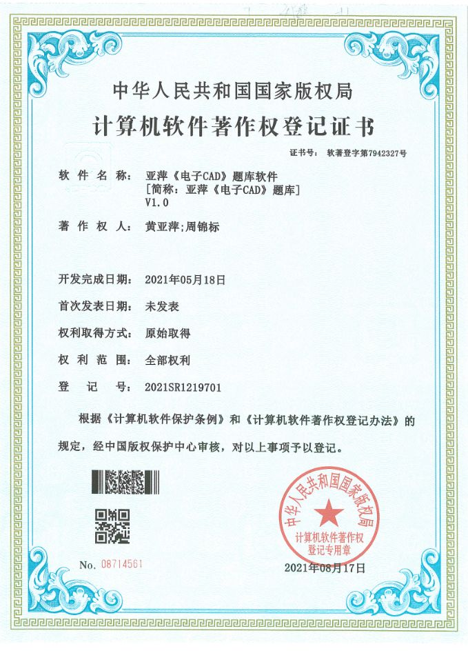 亚萍《电子CAD》题库软件取得软件著作权登记证书