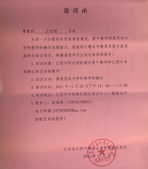 2011年11月29日,工作室导师王丽娟应邀江阴中专高新校区要求,为江阴中专高新校区全市共享培训做了题为《课程思政与学科教学的融合》的讲座