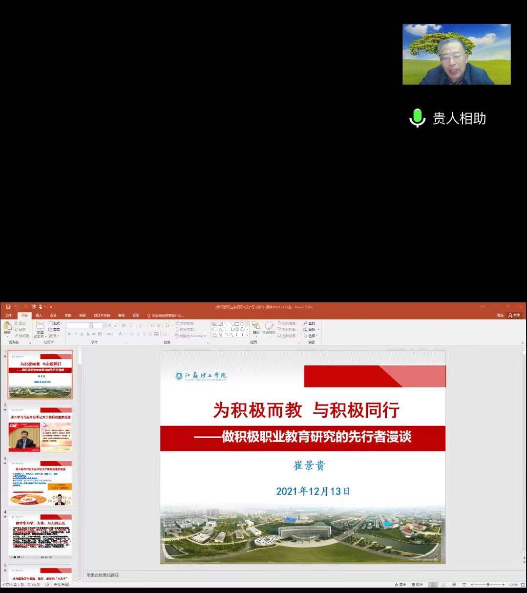 12月13日晚7:15,江阴市梅暖英名师工作室特邀江苏理工学院崔景贵教授为工作室成员和江阴中专高新区校区班主任作题为《积极职业教育研究的先行者》的专题讲座,讲座以腾讯会议形式进行,校区全体班主任聆听了讲座。讲座由学工处主任陈海燕主持。