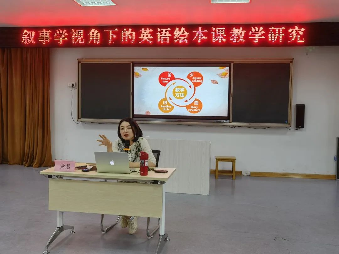接着,特邀专家黄慧老师对本节课进行了点评,黄老师对本节课给予了高度评价,充分肯定了徐老师的教学,指出徐老师用一连串的问题形成问题链,将绘本的内容结合语音从叙事角度进行了很好的教学实施。