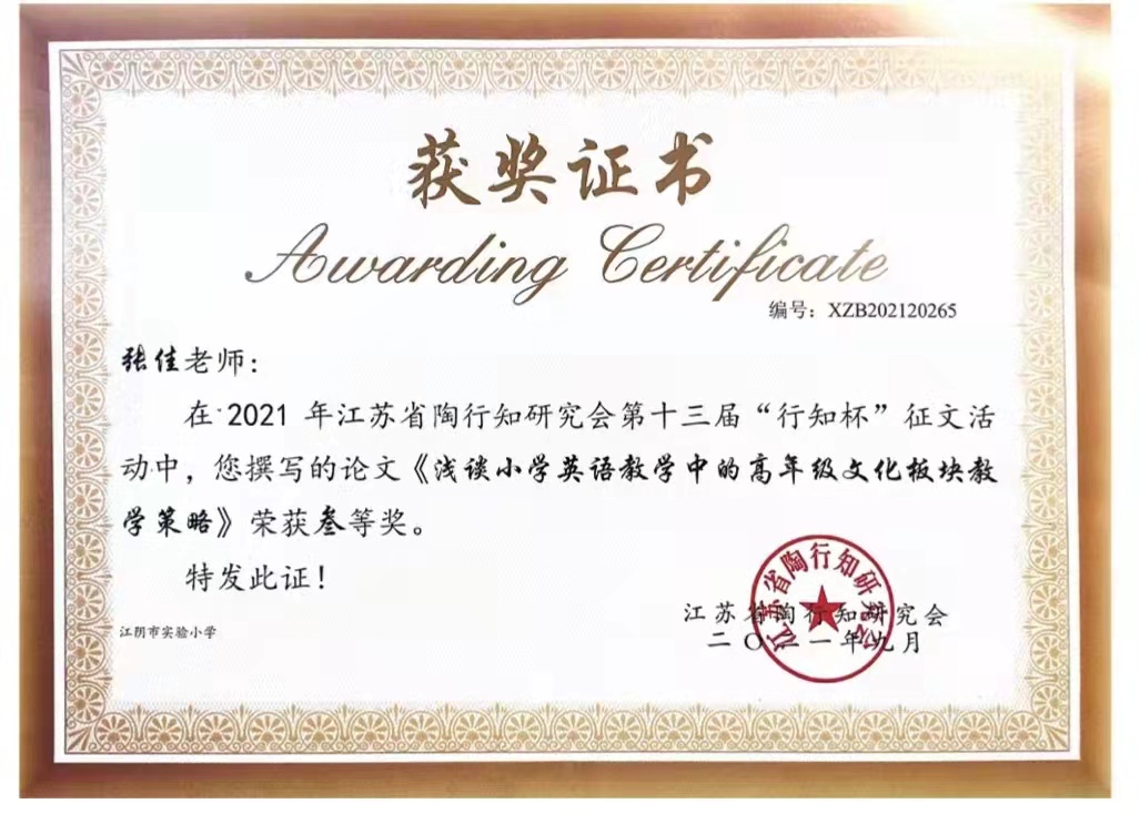 网站类目:研究成果获奖 姓名:张佳 所在单位:江阴市实验小学 获奖类别: 获奖级别:省级 获奖等级: 获奖时间:2022-04-10 评比部门: 发表刊物: 刊物级别:国家级 发表时间:2022-04-10