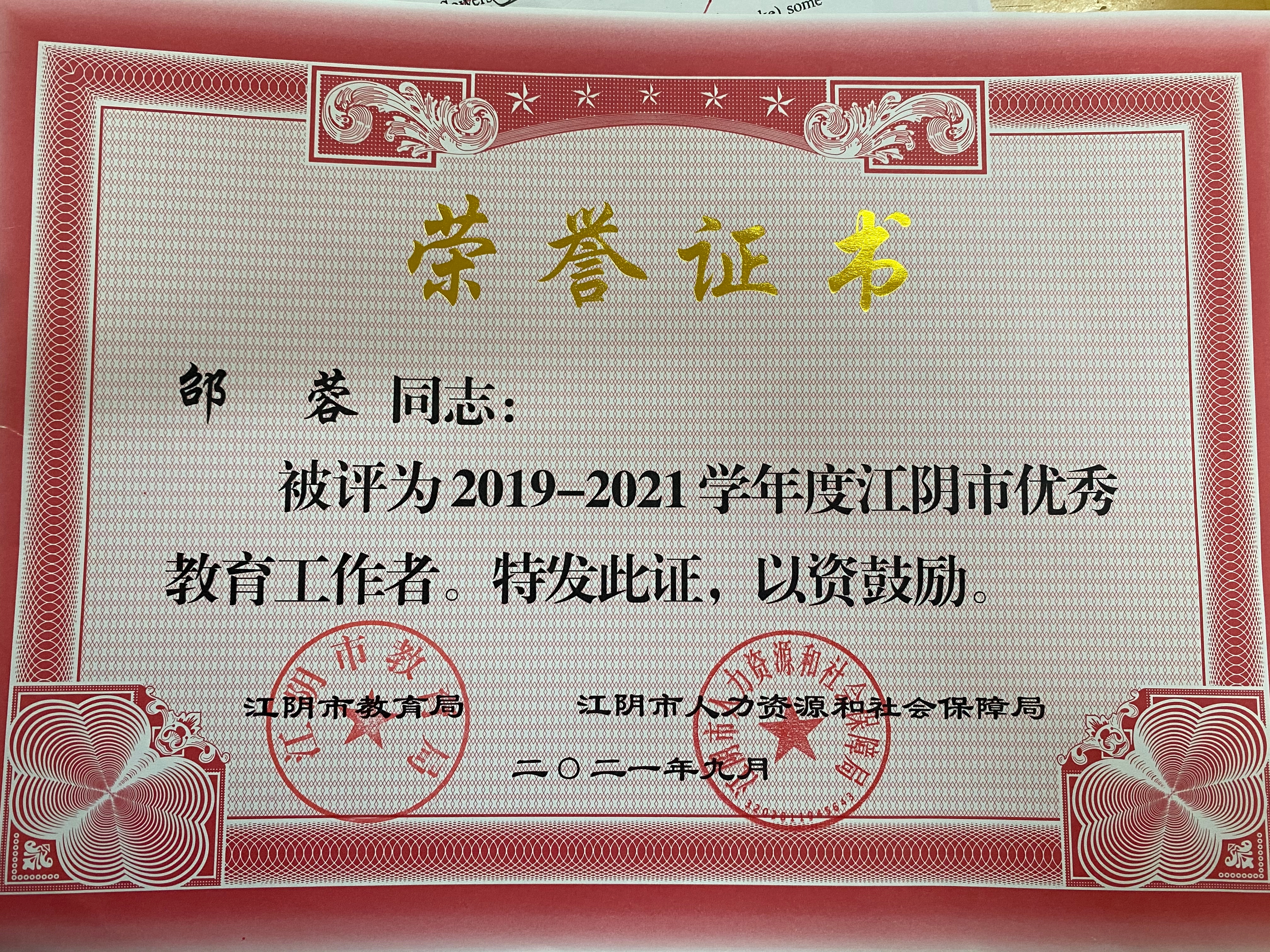 邵蓉老师被评为江阴市优秀教育工作者 2022-04-10