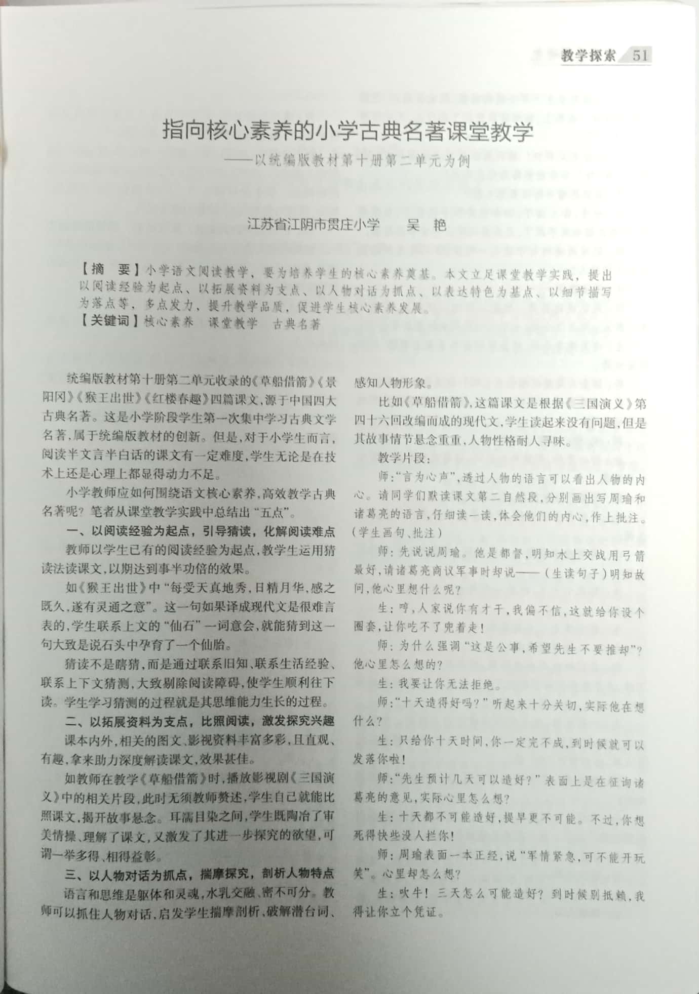 成员吴艳 论文《指向核心素养的小学古典名著课堂教学》发表