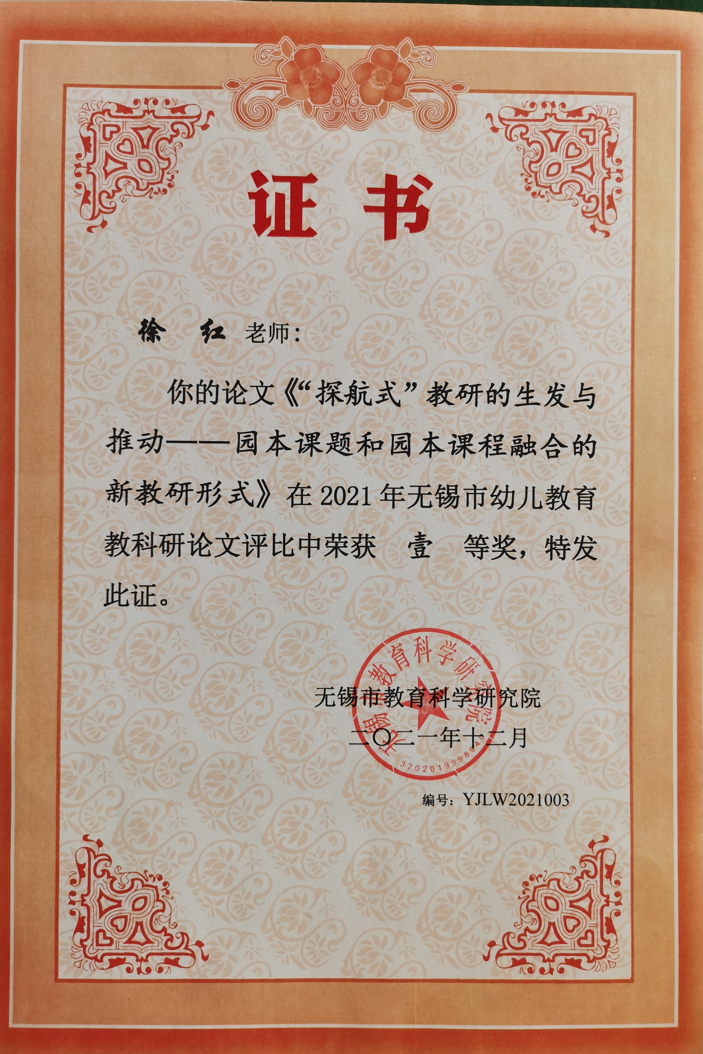 徐红老师论文《“探航式”教研的生发与推动》在2021无锡市幼儿教育教科研论文评比中获一等奖