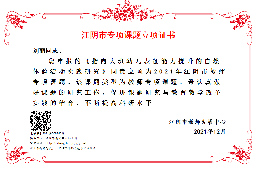 刘丽老师《指向打扮幼儿表征能力提升的自然体验活动实践研究》立项为2021年江阴市教师专项课题