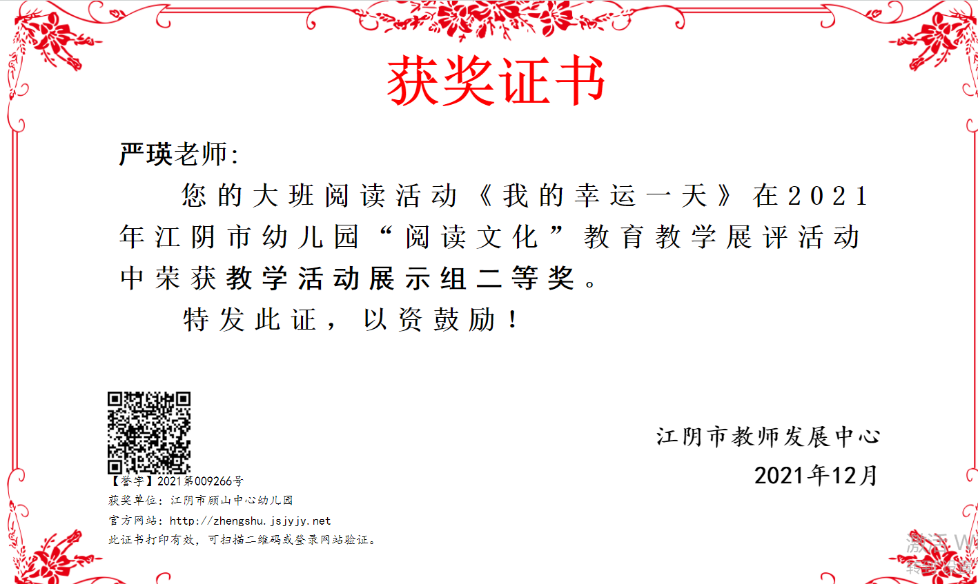 严瑛老师在江阴市幼儿园“阅读文化”教育教学展评中获得二等奖