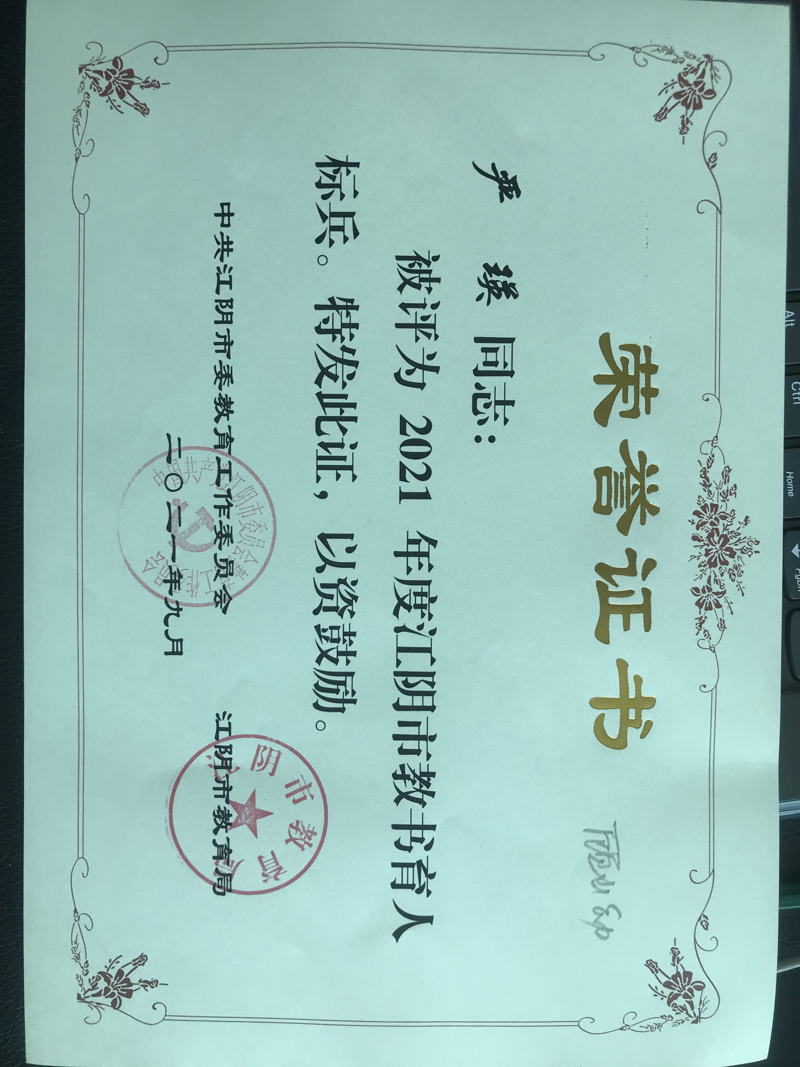 严瑛老师被评为2021年度江阴市教书育人标兵