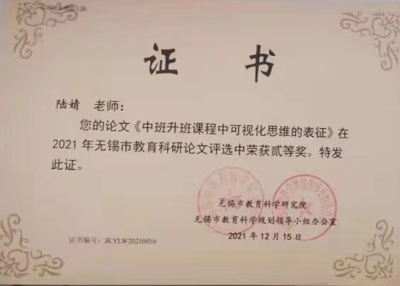 网站类目:研究成果获奖 姓名:陆婧 所在单位:江阴市城中中心幼儿园 获奖类别: 获奖级别:市级 获奖等级: 获奖时间:2021-12-15 评比部门:无锡市教育科学研究院 发表刊物: 刊物级别:市级 发表时间:2022-04-11