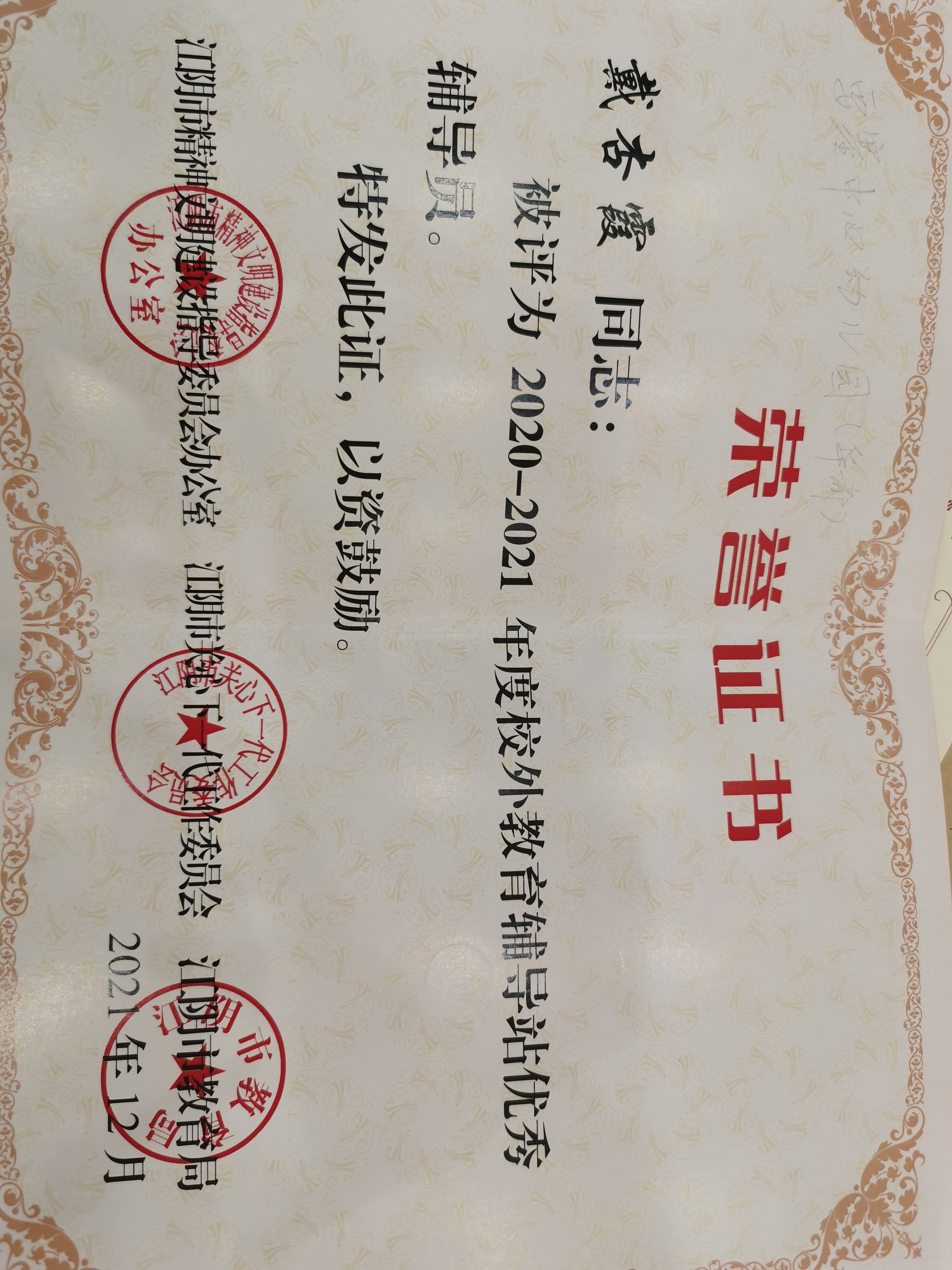 戴杏霞老师被评为2020-2021年度校外教育辅导站优秀辅导员