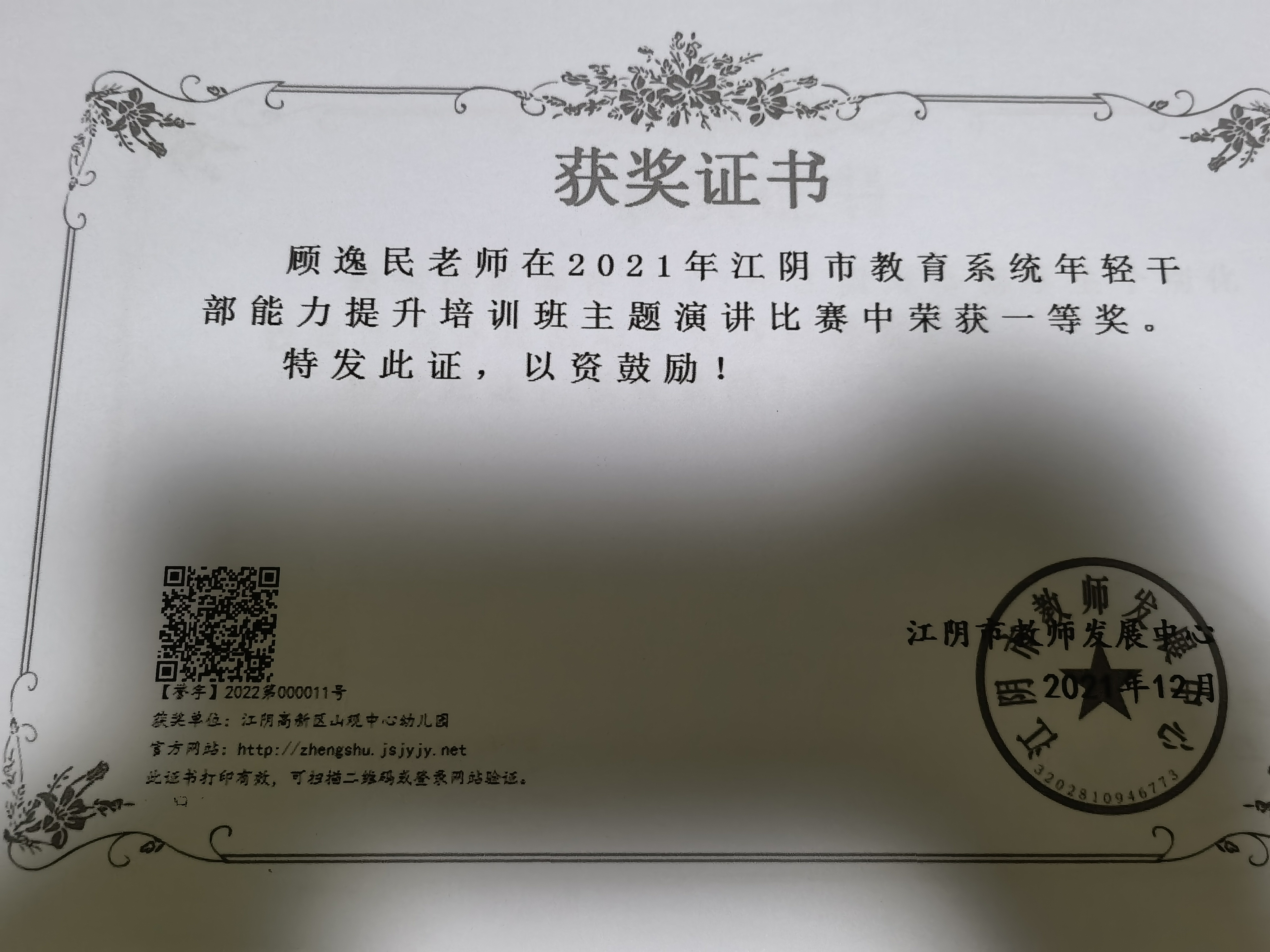顾逸民老师在江阴市教育系统年轻干部培训班主题演讲比赛中获一等奖