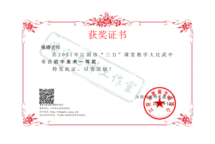 张婷获2021年江阴市“三力”课堂教学大比武初中美术一等奖 2022-04-11