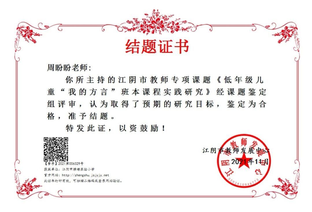 余家宇名师工作室成员 周盼盼老师德育课题结题