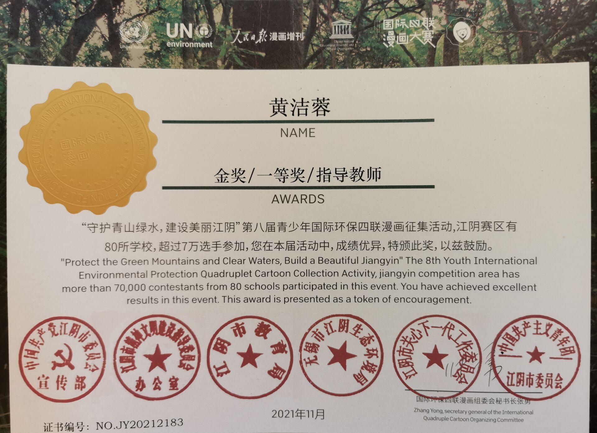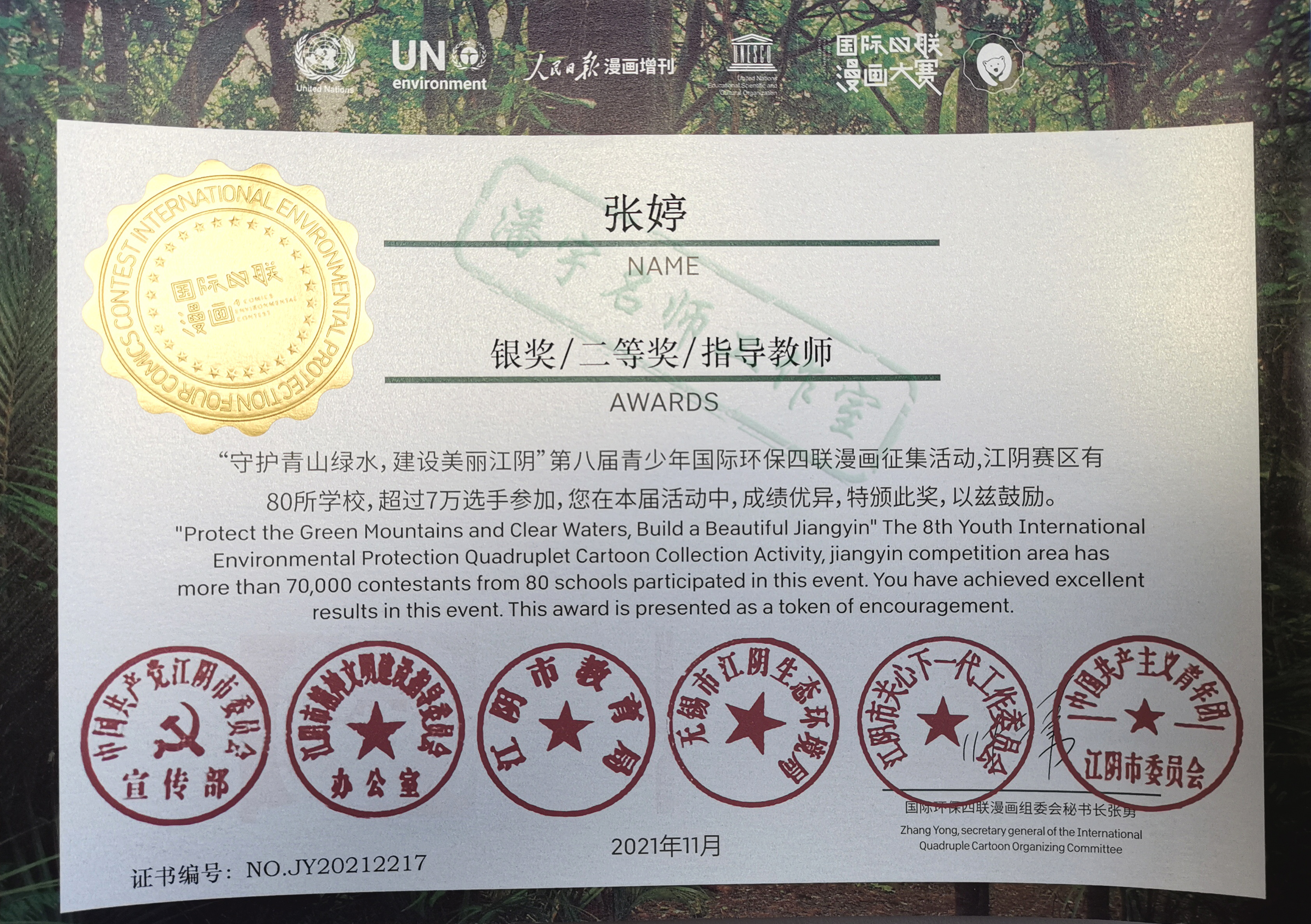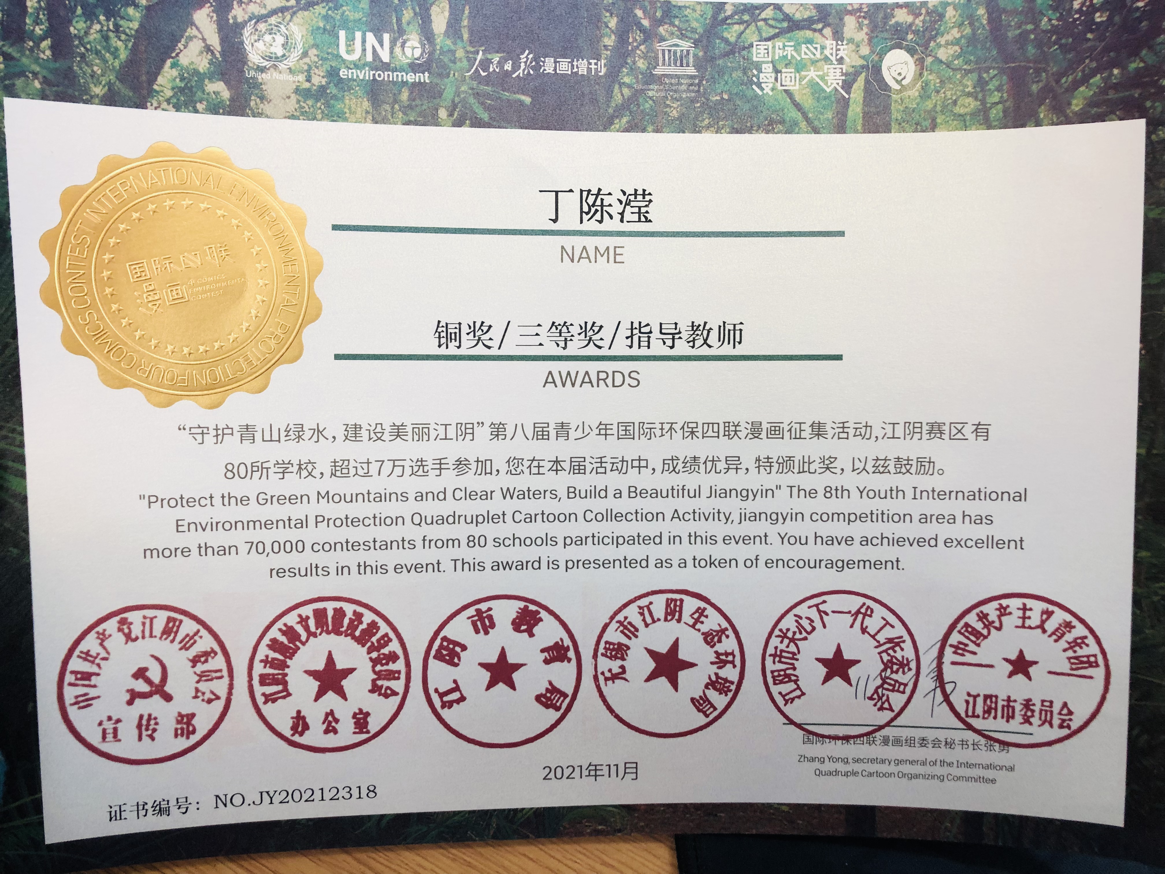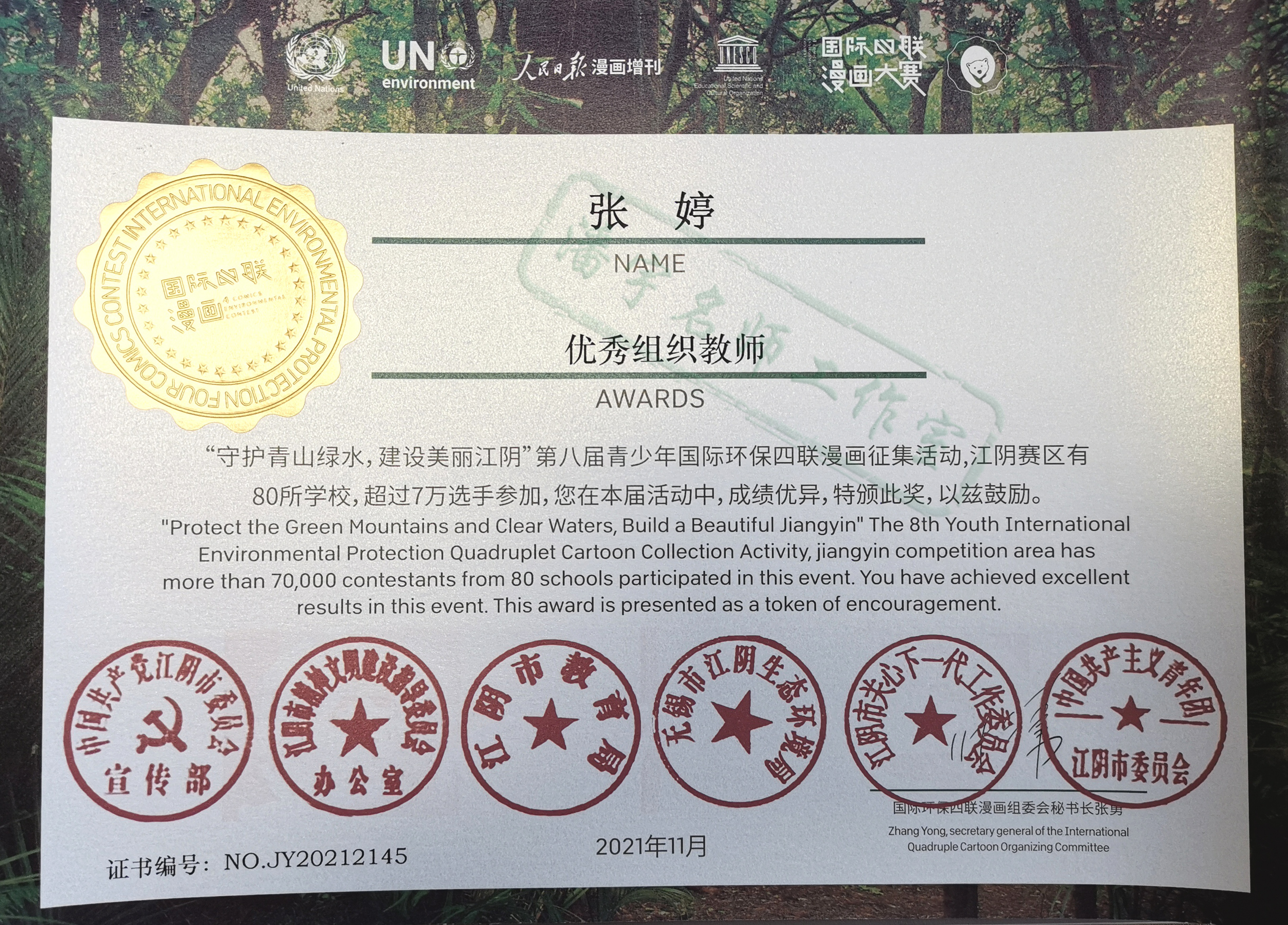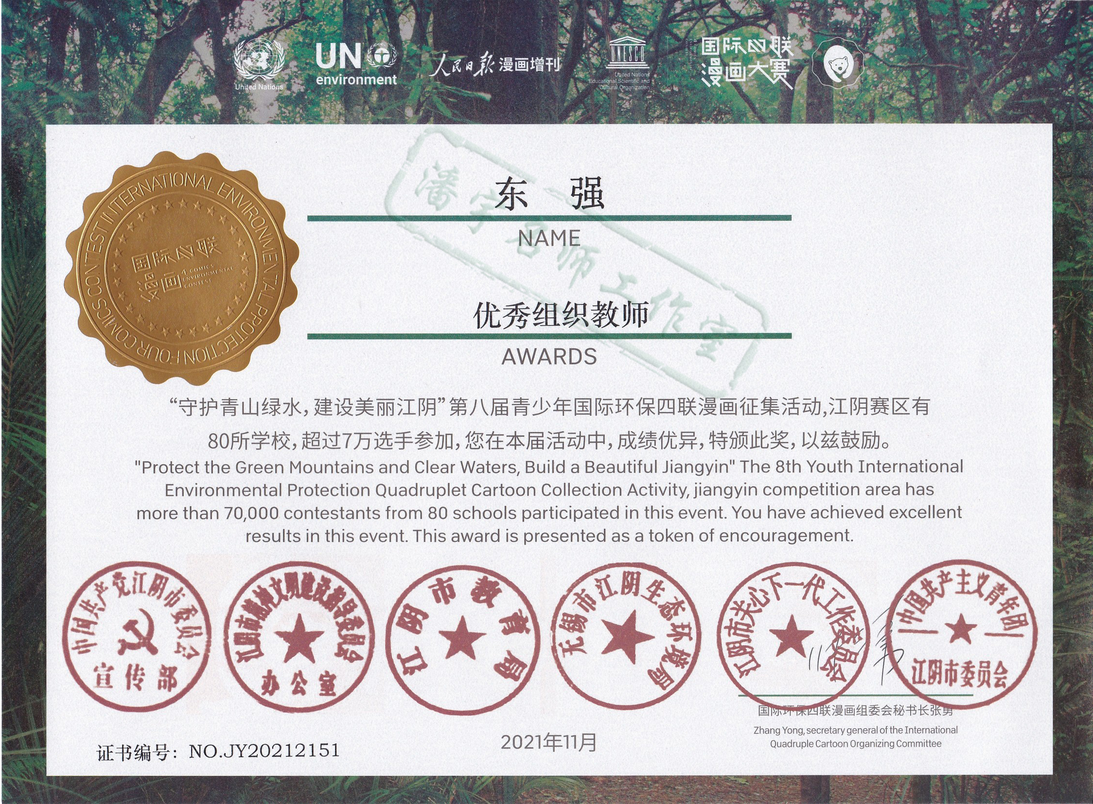 东强、黄洁蓉、丁陈滢、张婷第八届青少年国际环保四联漫画征集活动江阴赛区优秀组织教师及优秀指导奖