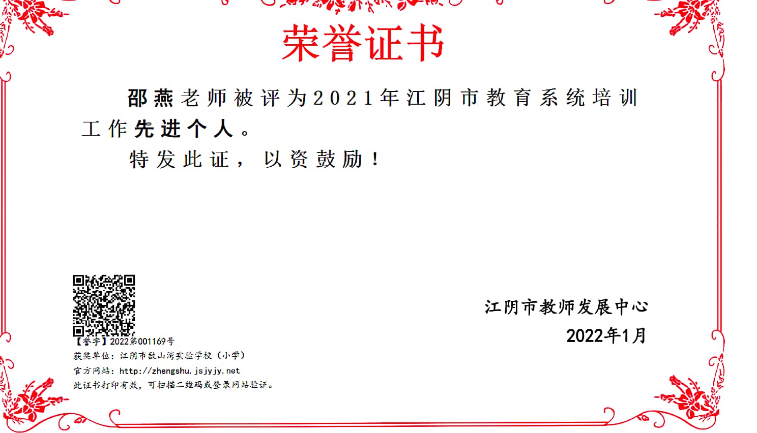 荣誉提升9:余家宇名师工作室成员邵燕获得江阴市教育系统培训工作先进个人