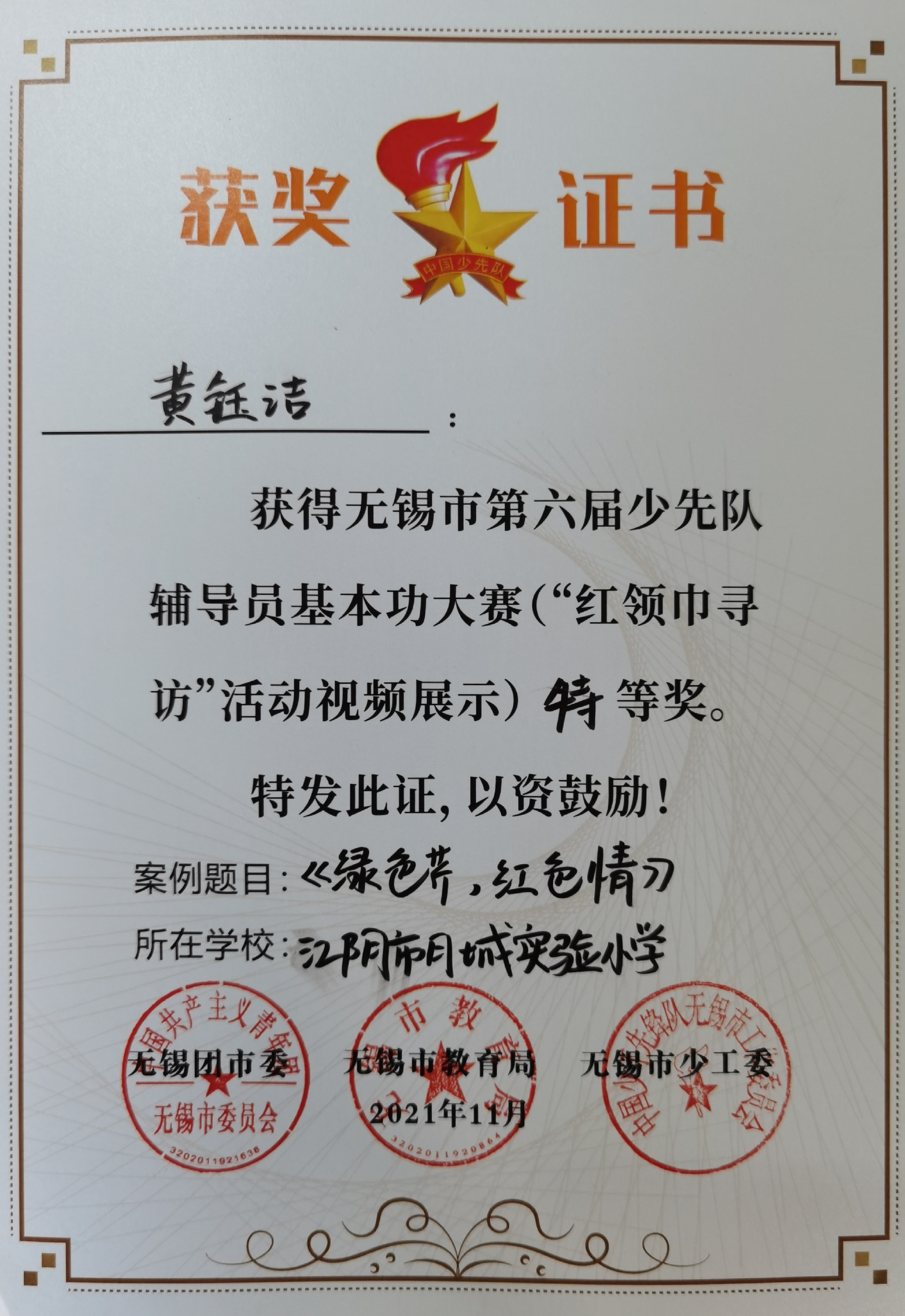 德育类奖项5:黄钰洁获得无锡市 第六届少先队辅导员基本功大赛特等奖