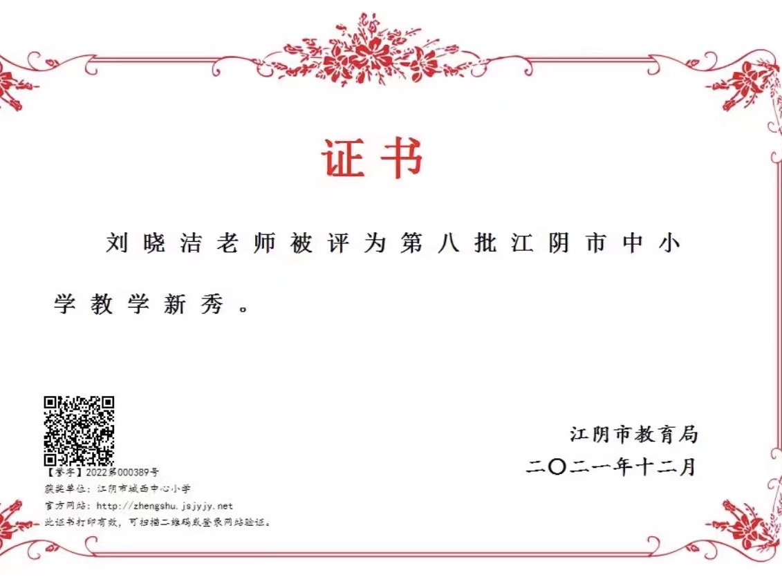 刘晓洁老师被评为第八批江阴市中小学教学新秀