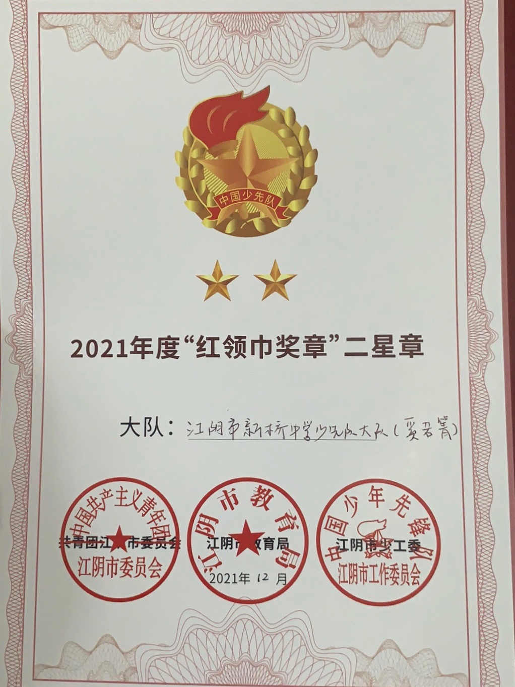 行政表彰——奚若菁获2021年度红领巾奖章二星章