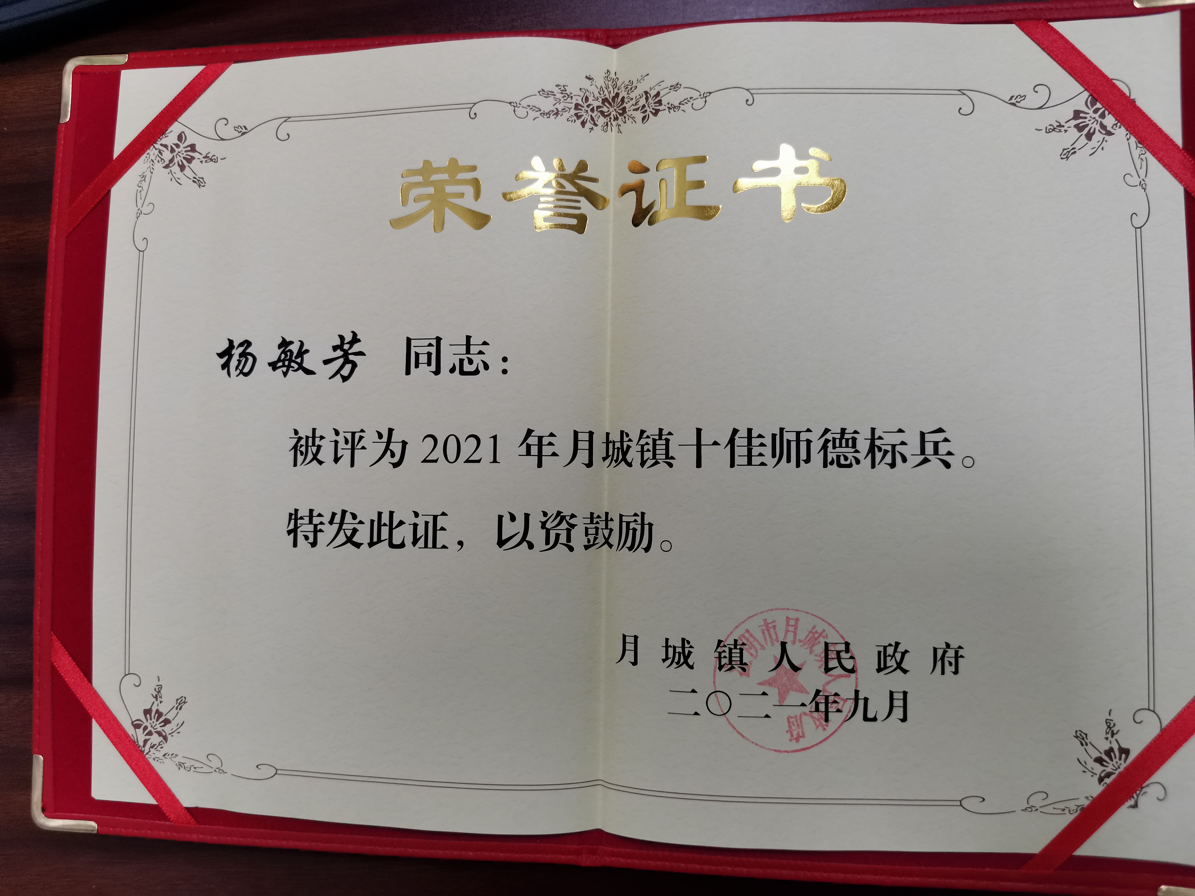 行政表彰——杨敏芳被评为2021年月城镇十佳师德标兵 2022-04-12