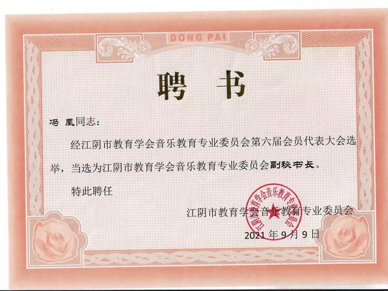 行政表彰——冯凰当选为江阴市教育学会音乐教育专业委员会副秘书长