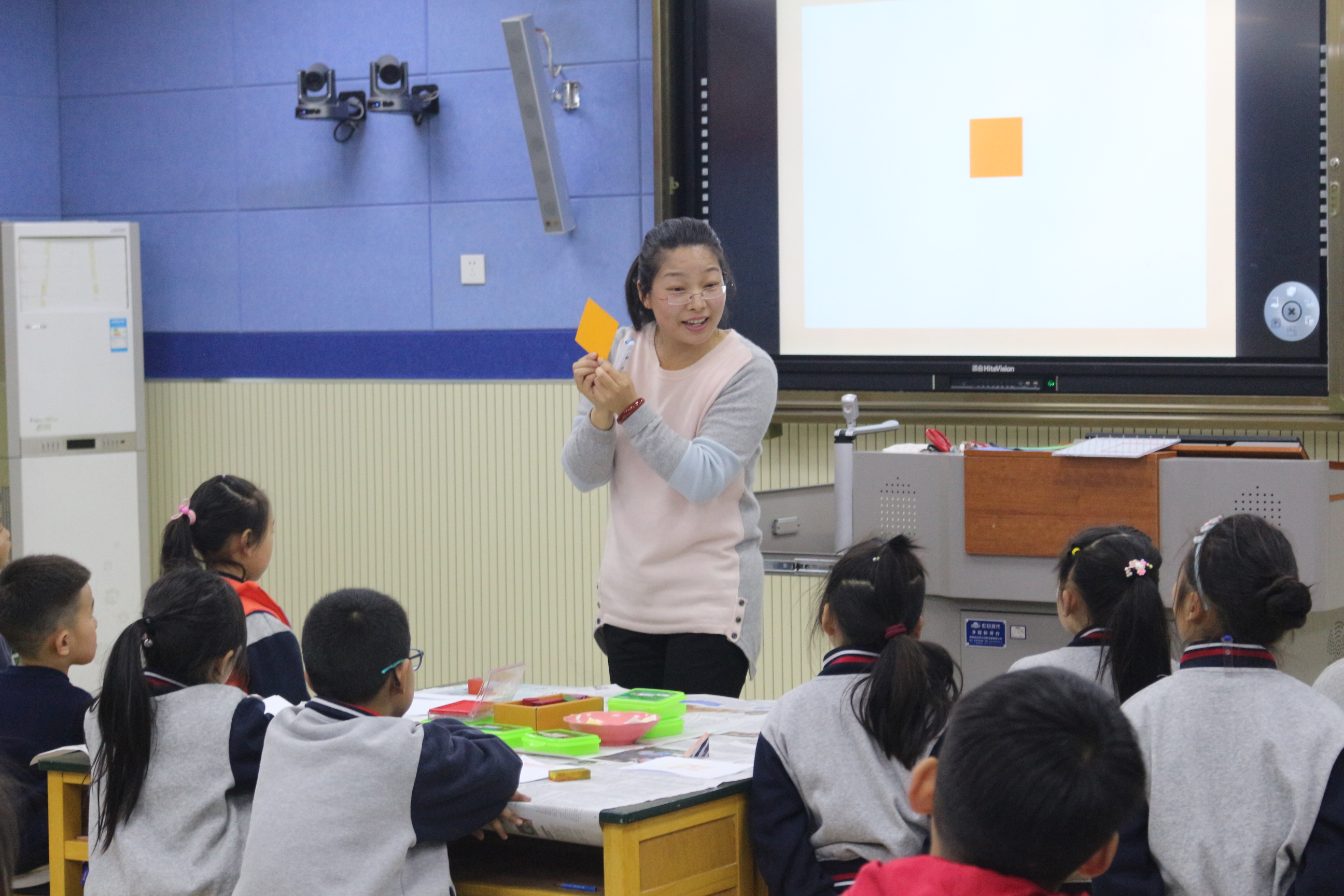师:这是什么形状的?现在呢?(正方形。)那这样呢?旋转一下。是什么形状?(正方形)转~现在呢?(正方形)。(每一次及时赞同。)