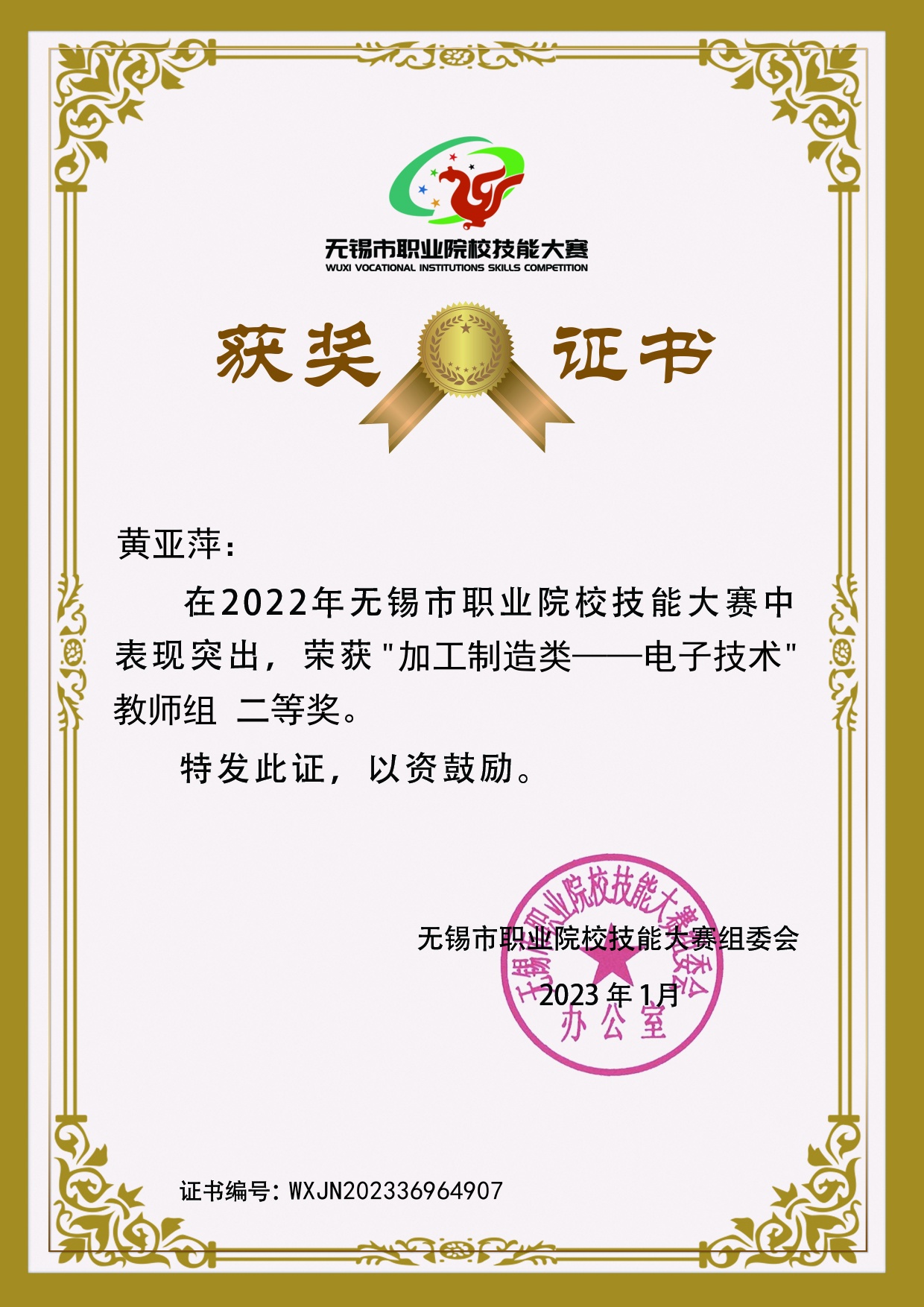黄亚萍老师获2022“中国银行杯”无锡市技能大教师组二等奖