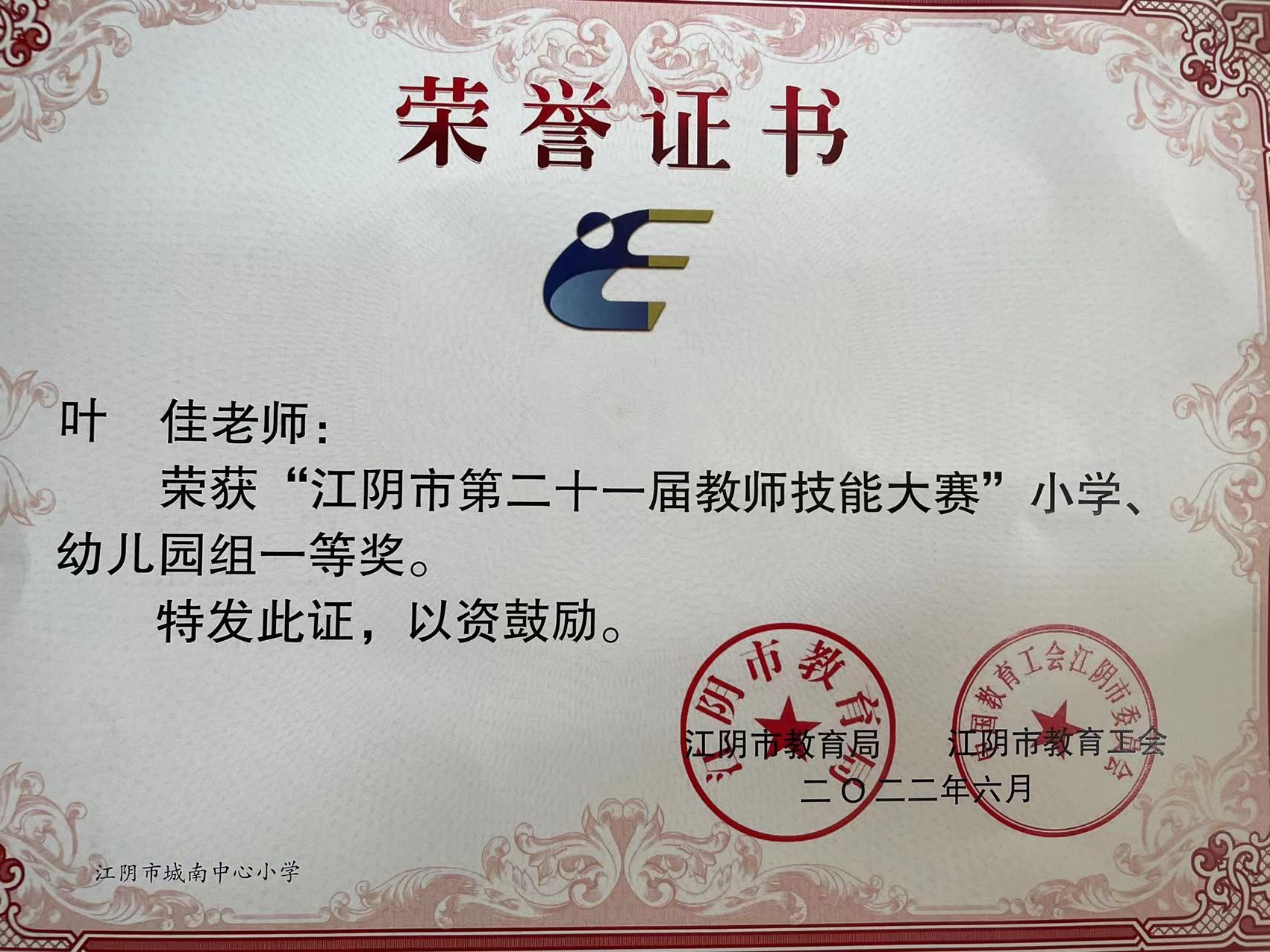 叶佳老师荣获“江阴市第二十一届教师技能大赛”一等奖