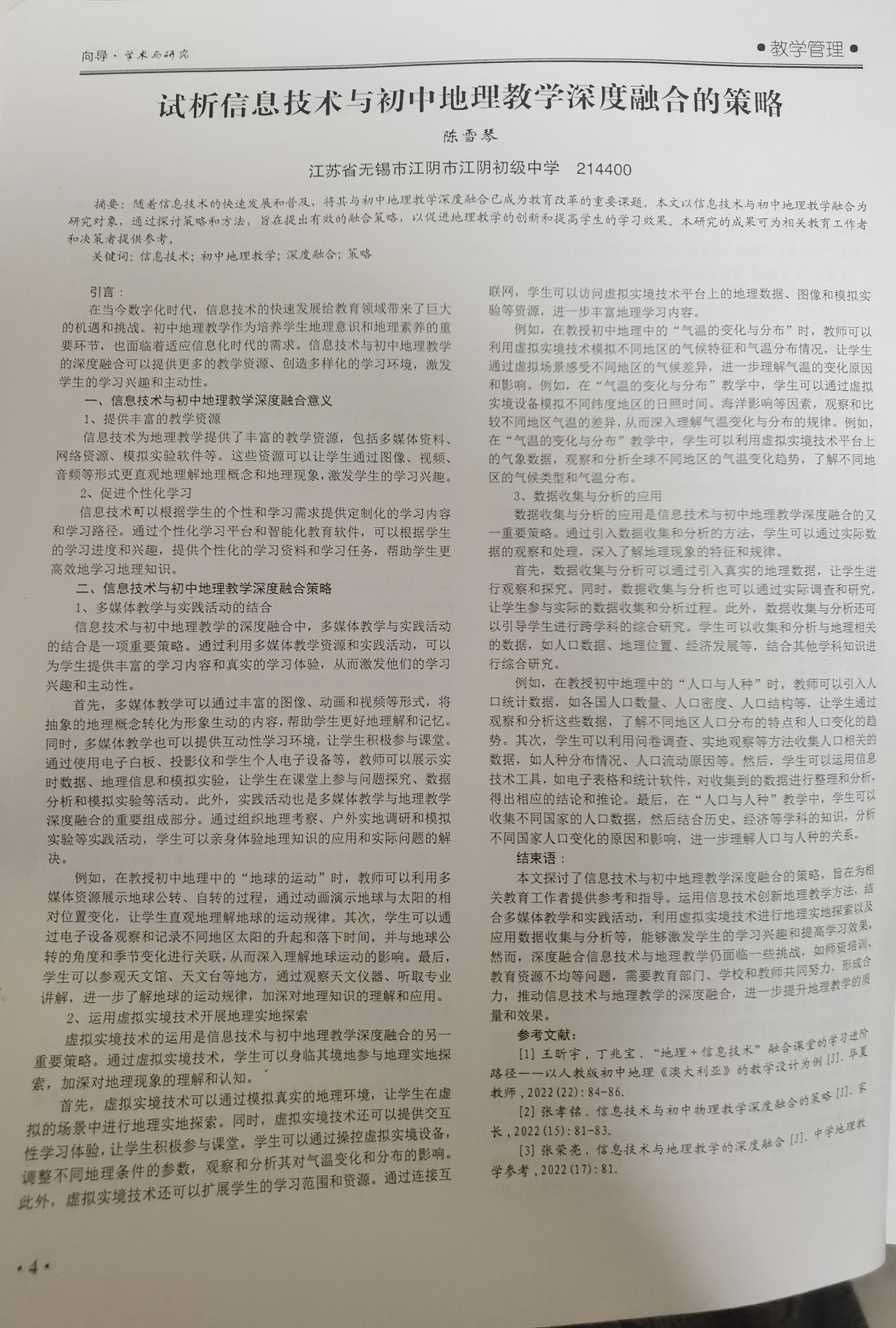 论文《试析信息技术与初中地理教学深度融合的策略》发表—陈雪琴