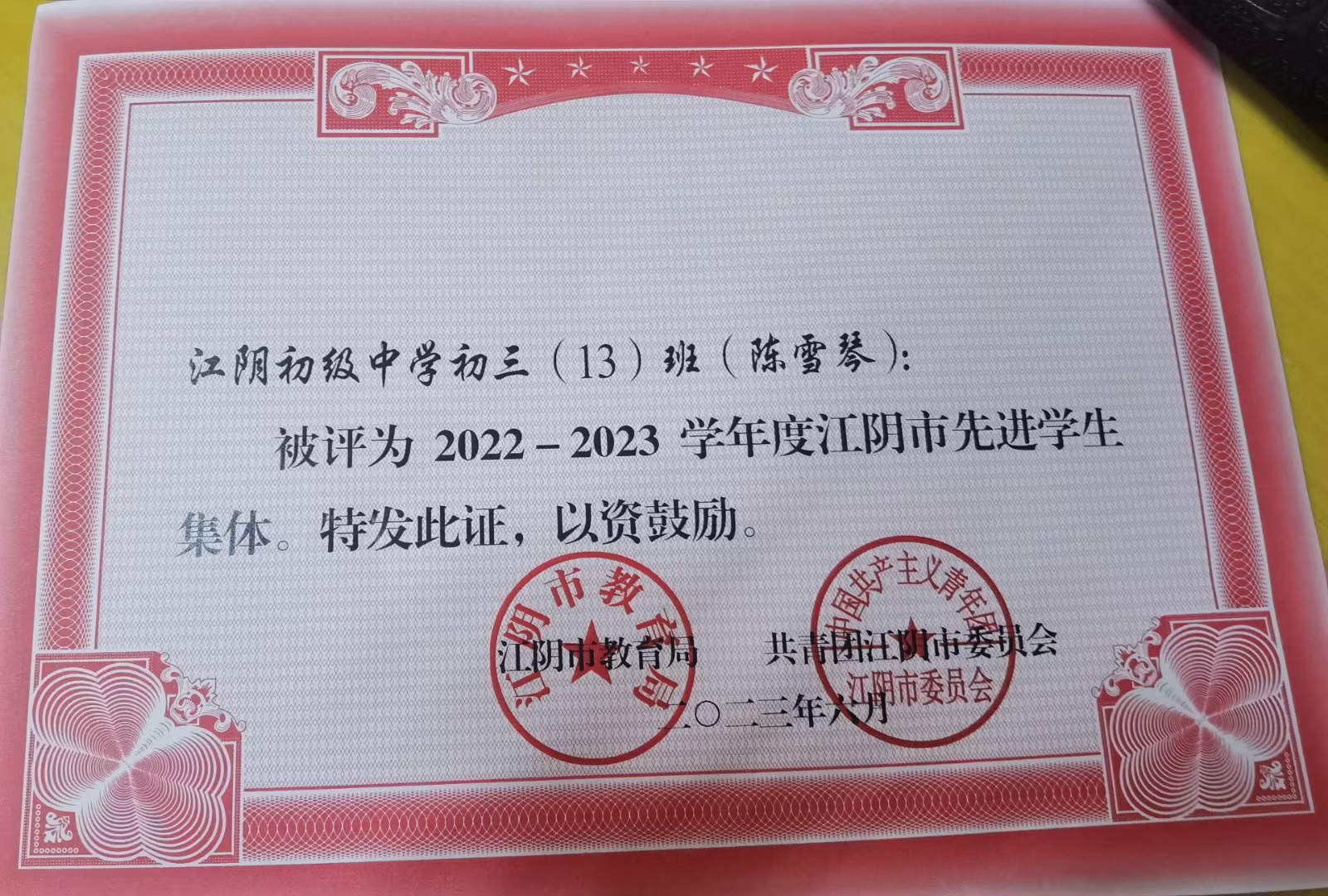 江阴初级中学初三(13)班(陈雪琴)被评为2022—2023学年度江阴市先进学生集体