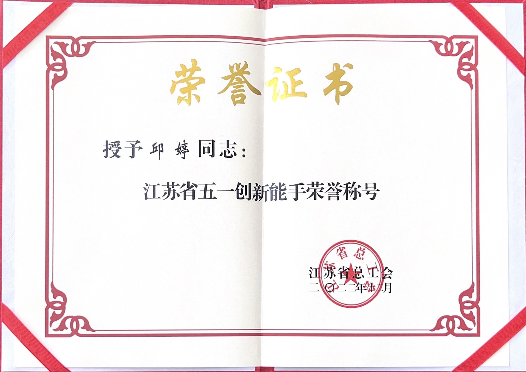 热烈祝贺邱婷老师被江苏省总工会授予“江苏省五一创新能手”荣誉称号