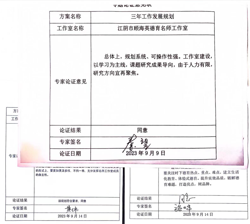 工作室顾问张烨主任、黄伟副科长、秦望主任分别对江阴市顾海英德育名师工作室三年规划做了认真、客观的论证,充分肯定了工作室三年规划制定的规范性、科学性、示范性和可行性,同时也提出了宝贵意见与建议。