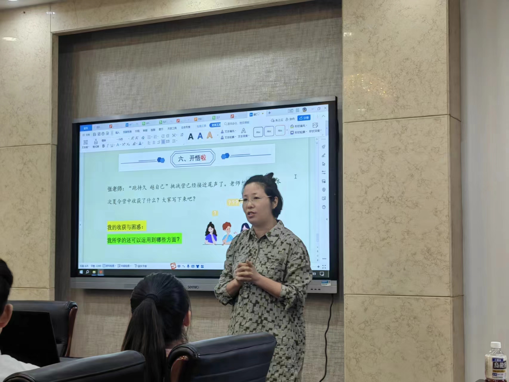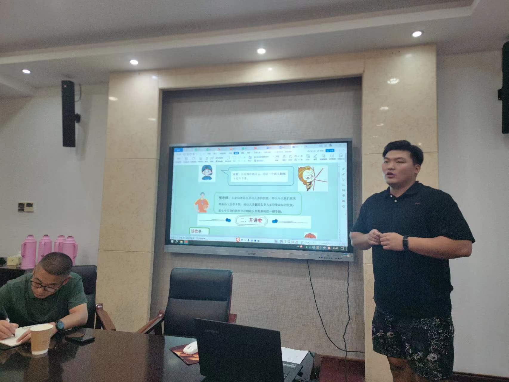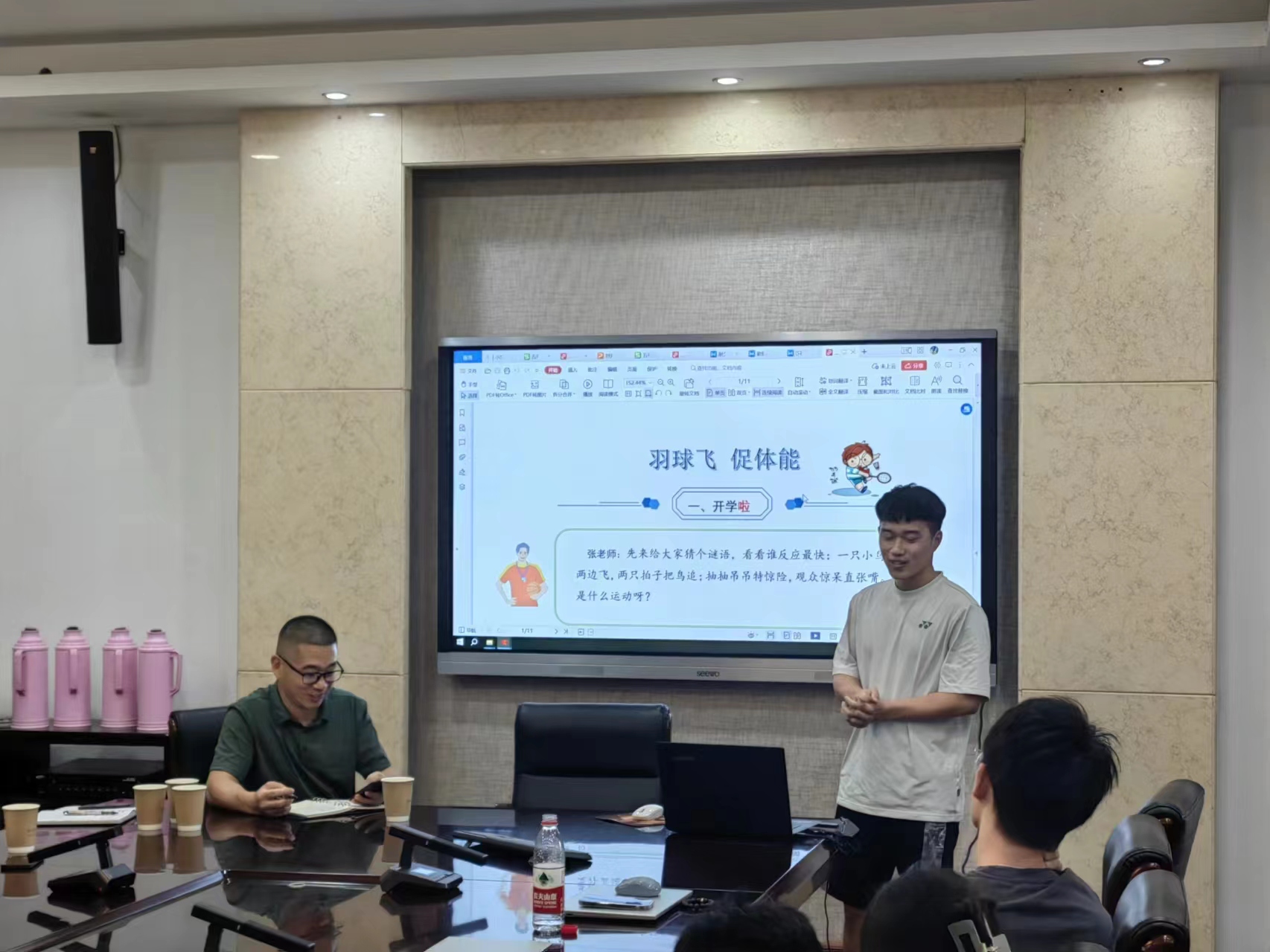 活动当日,刘培龙老师先讲述了《体育与健康手册》编写指南,从宗旨到定位再到总体思路,给成员们指明了大方向,沈菁老师具体讲述了为实现学生的全面发展,核心素养的培育的执行载体—“六开”。